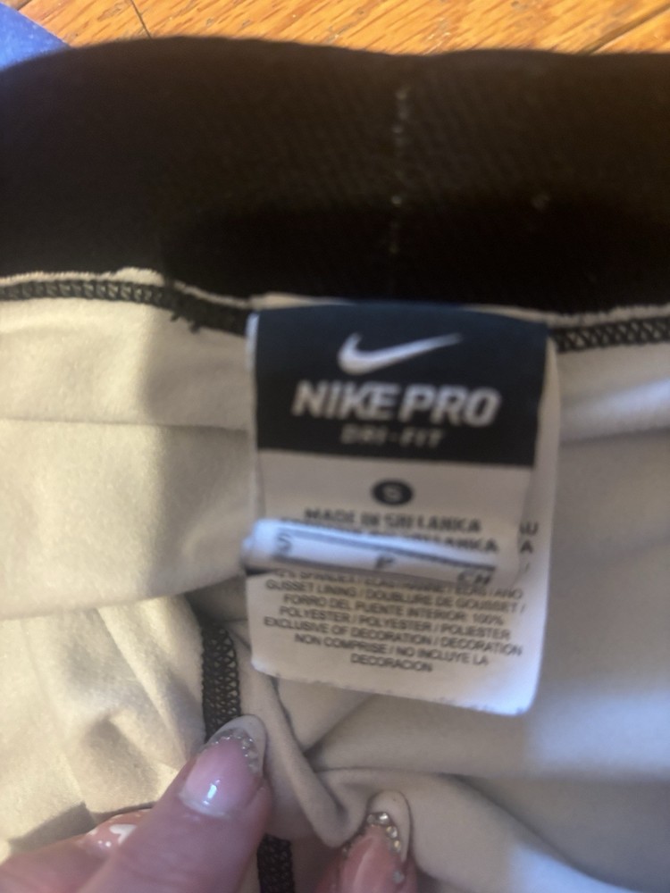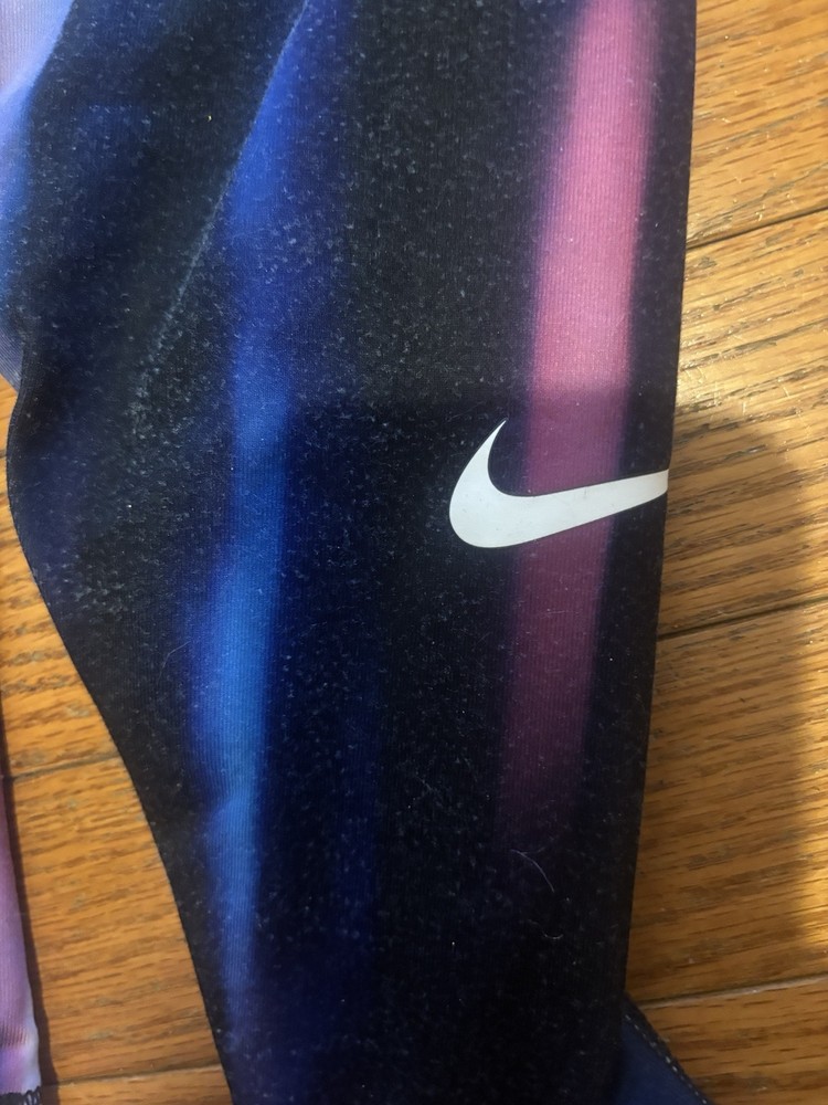 This pre-owned pair of Women’s Nike Pro Dri Fit Leggings is designed for athletic activities like running, CrossFit, and gym training. The leggings are size Small with a compression fit and feature an elastic waist for comfort and support. Made of a blend of polyester and spandex, they offer flexibility and moisture-wicking properties. The multicolor design, solid pattern, and Nike branding add a stylish touch to this activewear essential. Perfect for women who prioritize performance and style during their workouts. Shows some sign on wear. You will get a ton of compliments. Very different leggings!