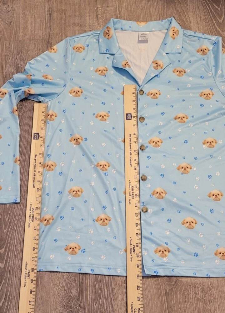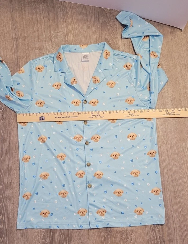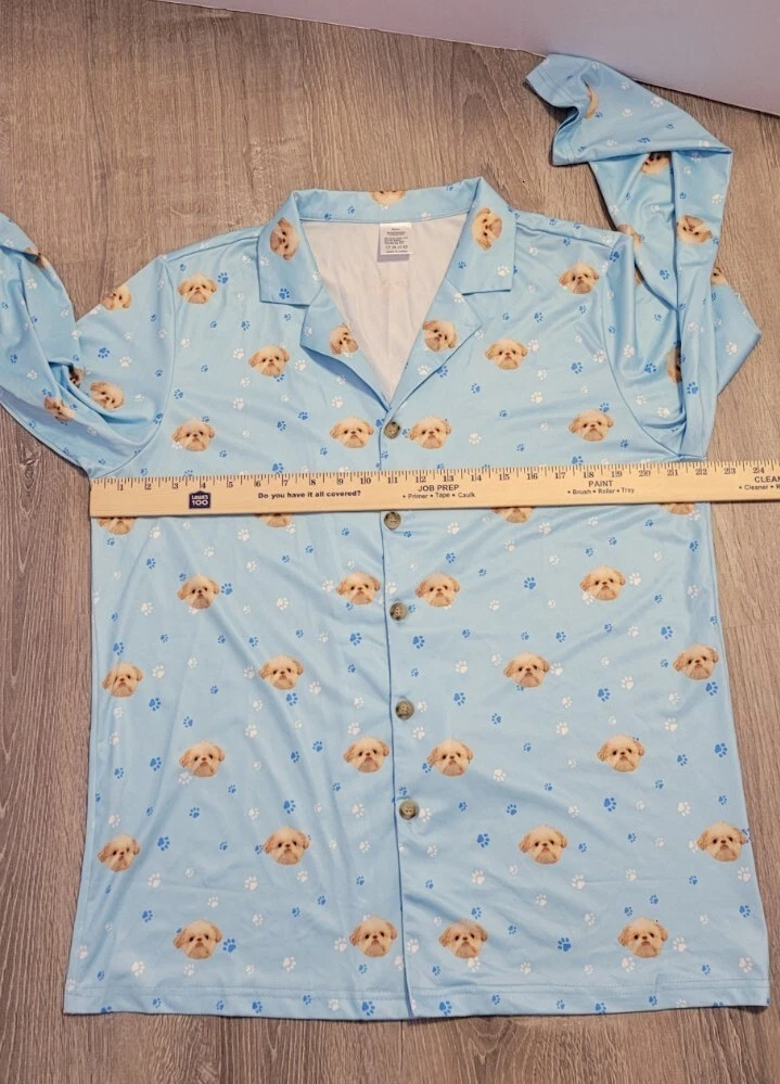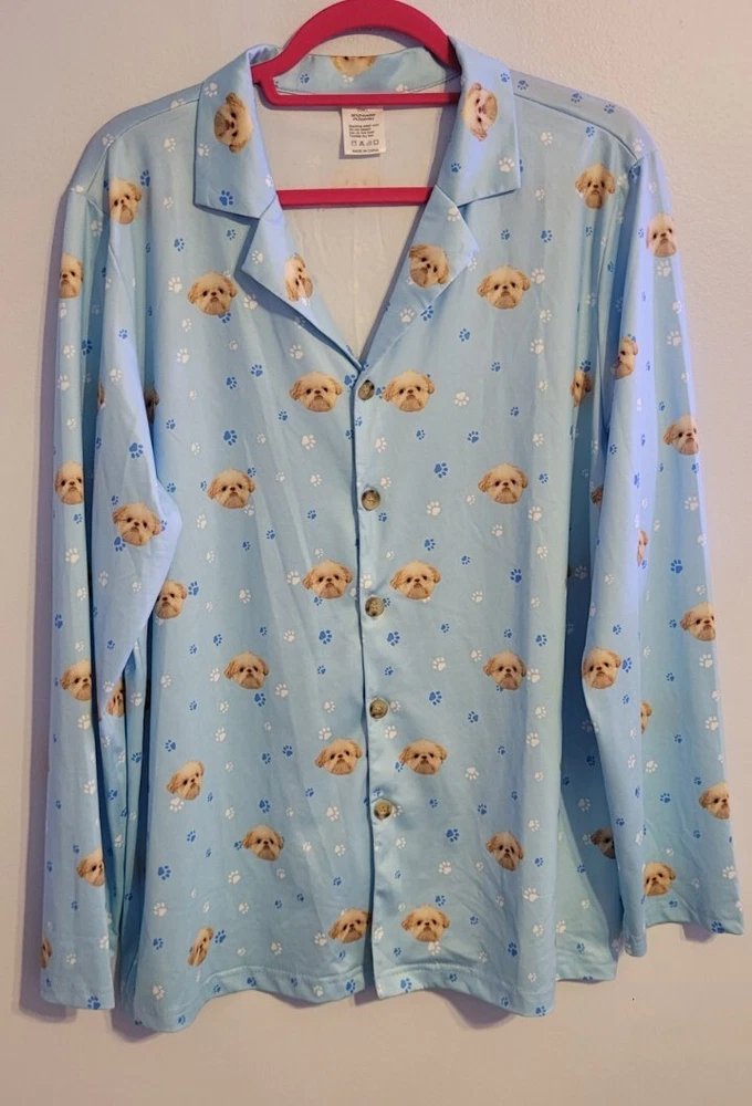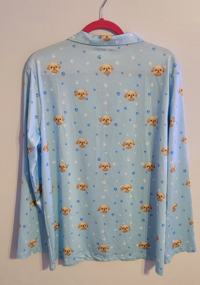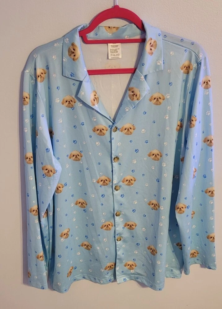 Department: Women Size: L Color: Multicolor Closure: Button Vintage: No Accents: Button Style: Top Brand: Unbranded Season: Fall,Winter Type: Pj Top Theme: Dog Garment Care: Machine Washable Neckline: Collared Fabric Type: Satin Character: Dog Sleeve Length: Long Sleeve Material: Polyester Size Type: Regular