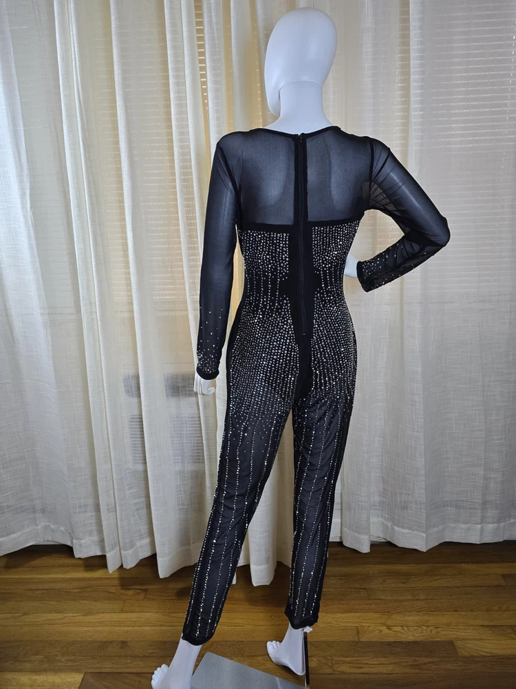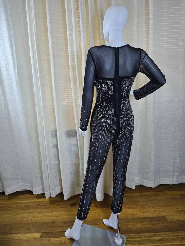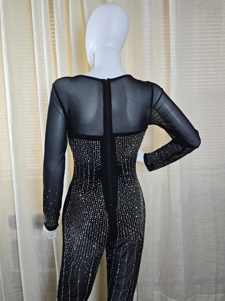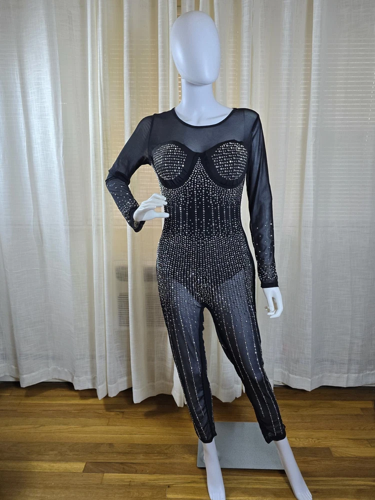 Womens long sleeve Mesh Rhinestone Black jumpsuit Size XL