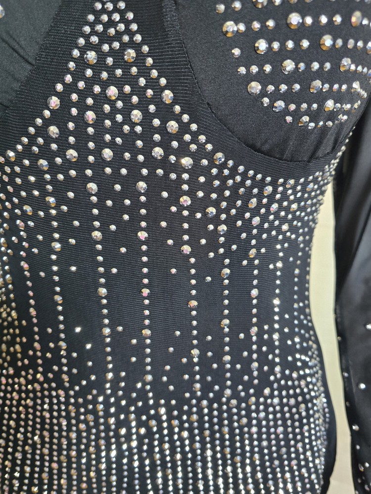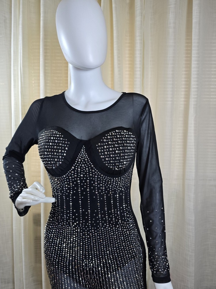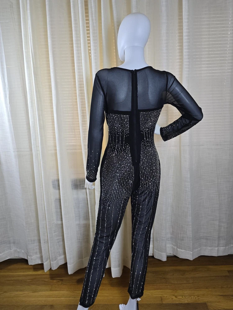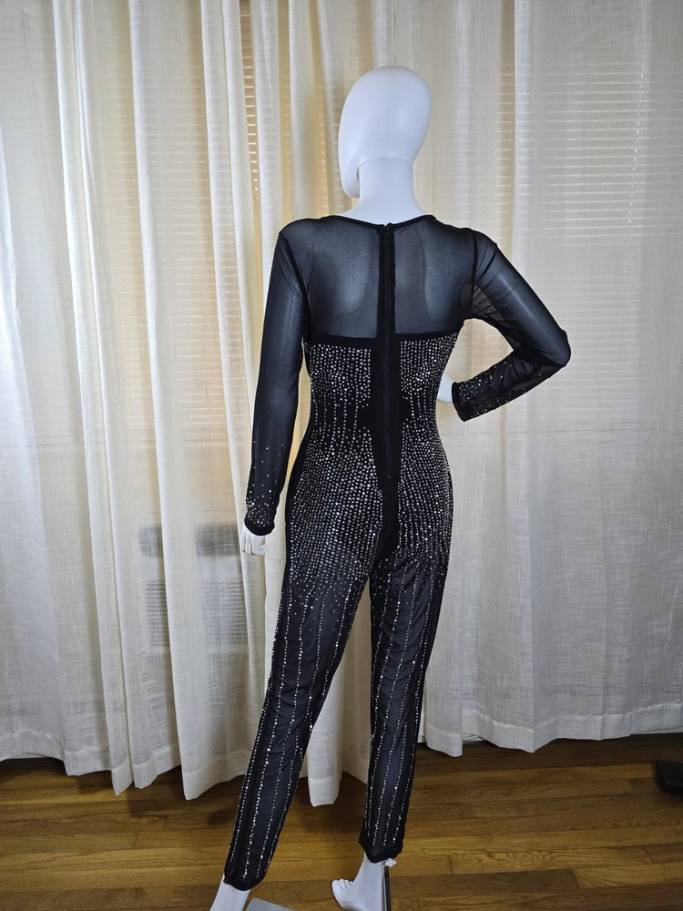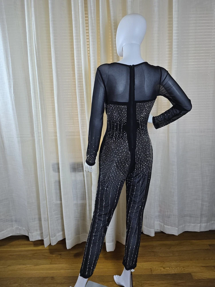Womens long sleeve Mesh Rhinestone Black jumpsuit Size XL