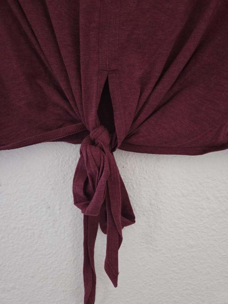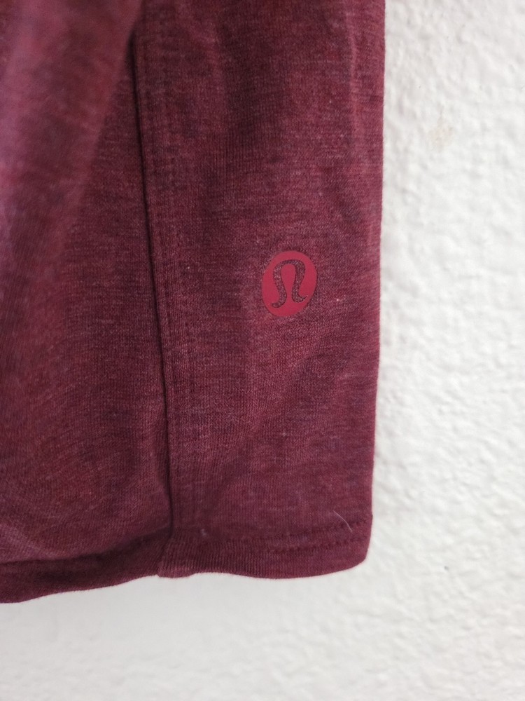 This Women's Lululemon maroon tie waist short sleeve t-shirt in size 6 is a versatile activewear top suitable for various occasions. With a solid pattern, round neckline, and pullover closure, this t-shirt offers a comfortable and classic fit for everyday wear. Made from lightweight, stretchy, and breathable materials, it is perfect for activities like walking, yoga, and running. The vibrant red color and basic style make it a great addition to any wardrobe, representing themes of city, sports, and logo. Pit to pit 17 1/2 inches Full length 17 1/2 inches