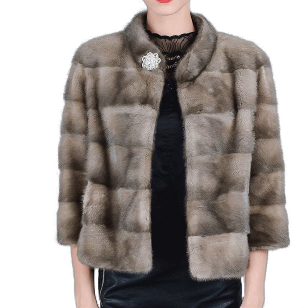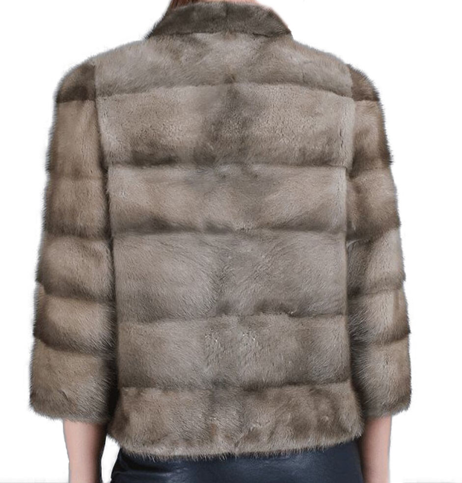 I tem Description: Stylish and natural lutetia (gray/brown) color mink fur jacket coat. Top quality soft and supple full mink fur pelts in a horizontal design, 3/4 sleeves , durable furrier closures, front pockets and quality satin lining complete the look of this gorgeous mink fur jacket SIZE: 10 Most sizes available LENGTH: 21"