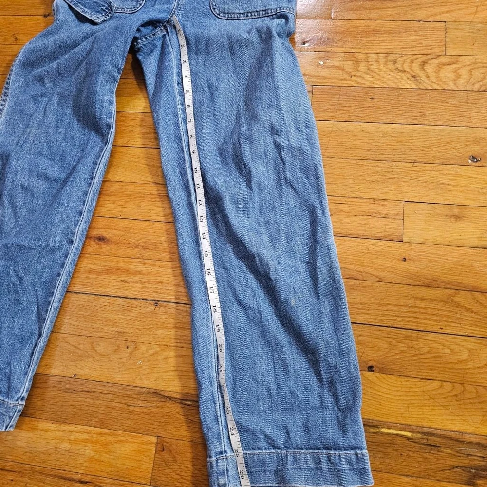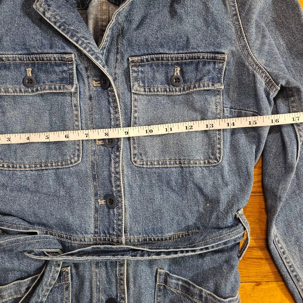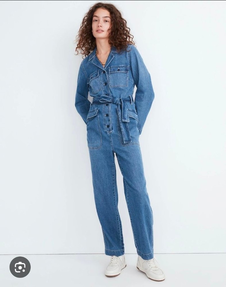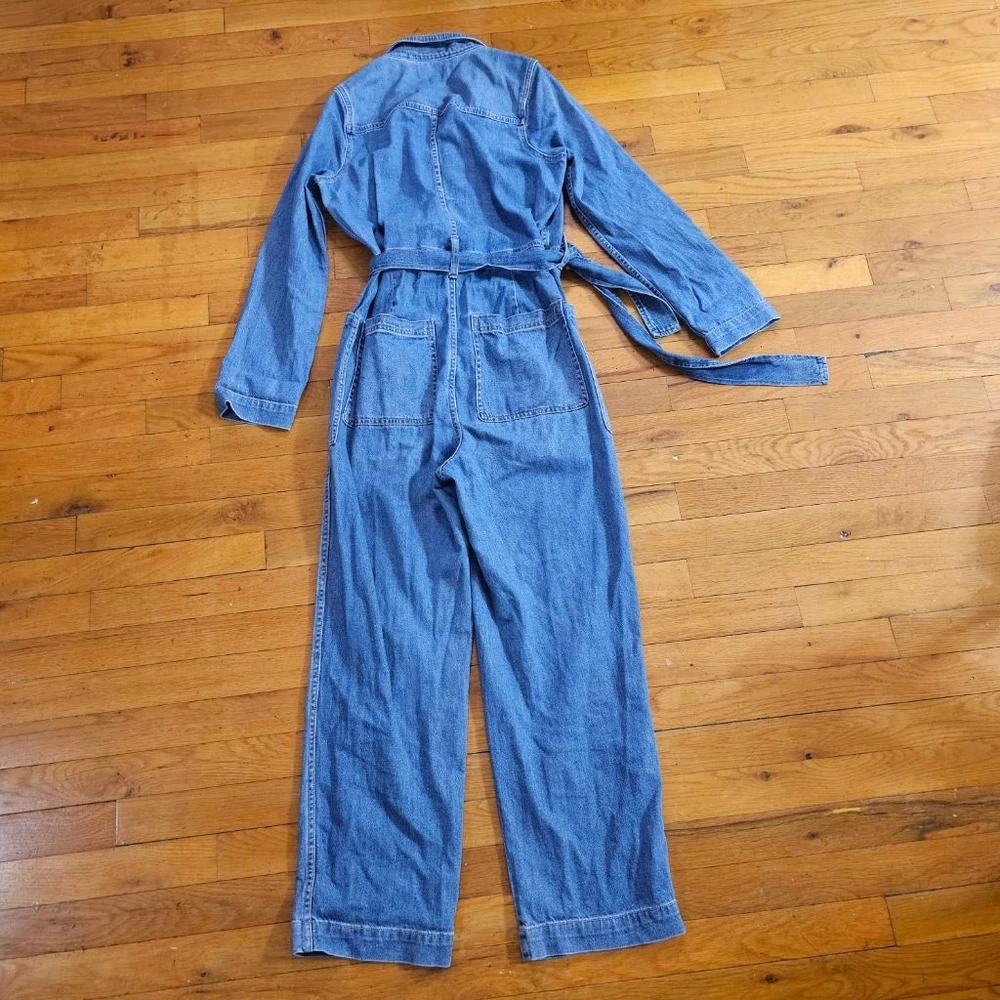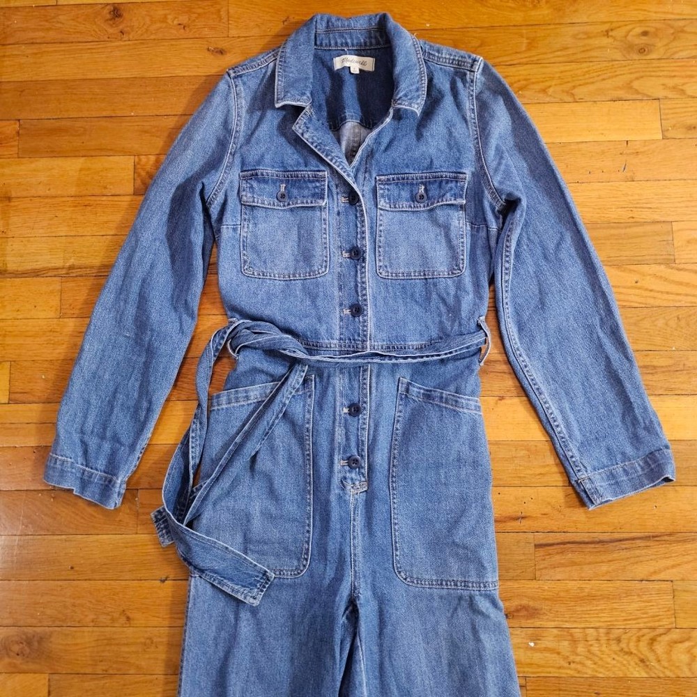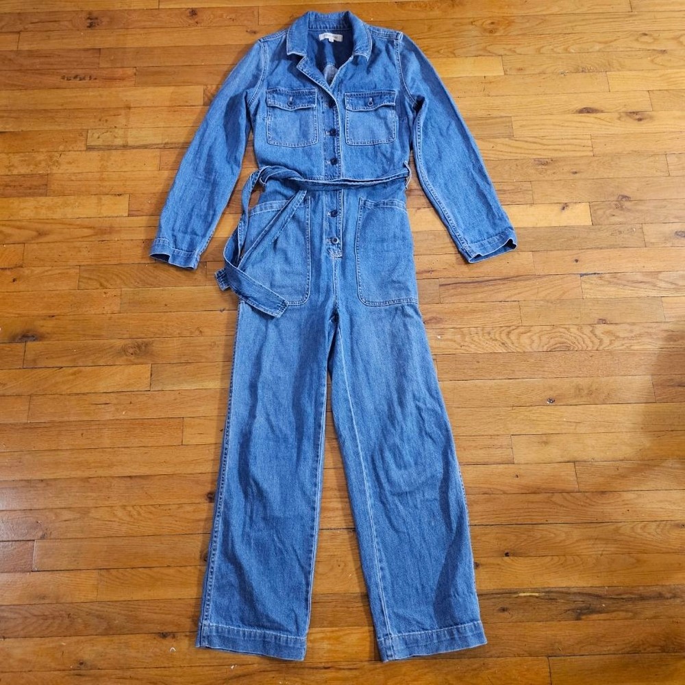 Kindly note: Items are not washed and may have scents (detergent or used clothing). Any stains, rips, or defects are clearly shown in the photos, and actual measurements are included there as well. Orders ship within 1–3 business days. If you have any questions or issues with your order, feel free to message me — I’m happy to help! This is a pre-owned Madewell denim jumpsuit in blue, size S. It features a collared neckline, long sleeves, and a full button-front closure. The jumpsuit has two chest pockets with button flaps and two large patch pockets on the hips. A matching denim belt is included, designed to tie at the waist. The legs are wide-cut, and the garment is made of 100% cotton. Visible measurements indicate a chest width of approximately 16 inches and an inseam of about 22 inches. The jumpsuit appears to be in good condition with no significant visible imperfections.