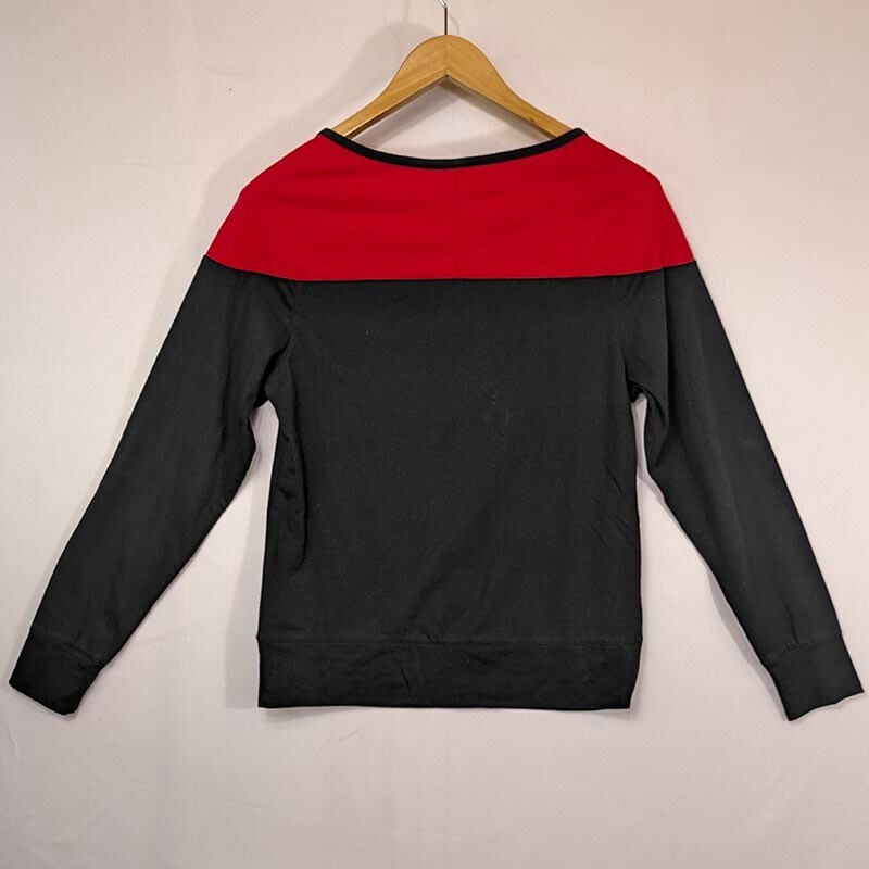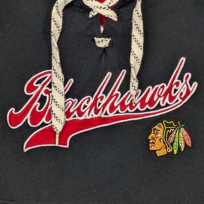 Reebok Chicago Blackhawks Pullover Shirt Jersey Womens NHL Long Sleeve Black & Red Style 3266W 11 Tie at Neck Kangaroo Pocket Size Medium 60% Cotton 40% Polyester Machine Wash Tumble Dry Pit to Pit 18" Length 23" Sleeve 20.5" All measurements are approximate and done with garment laid flat No tears, stains or holes Fast Shipping!