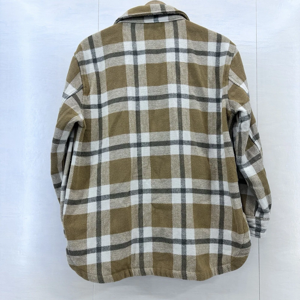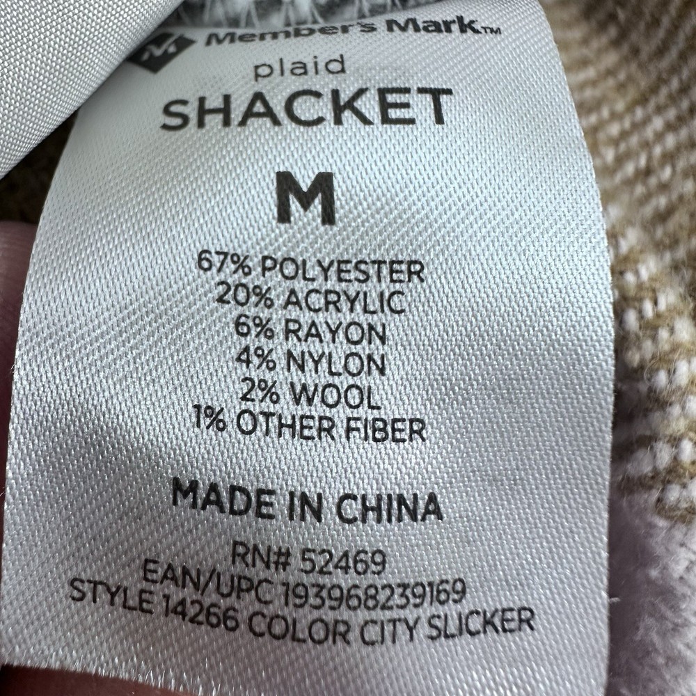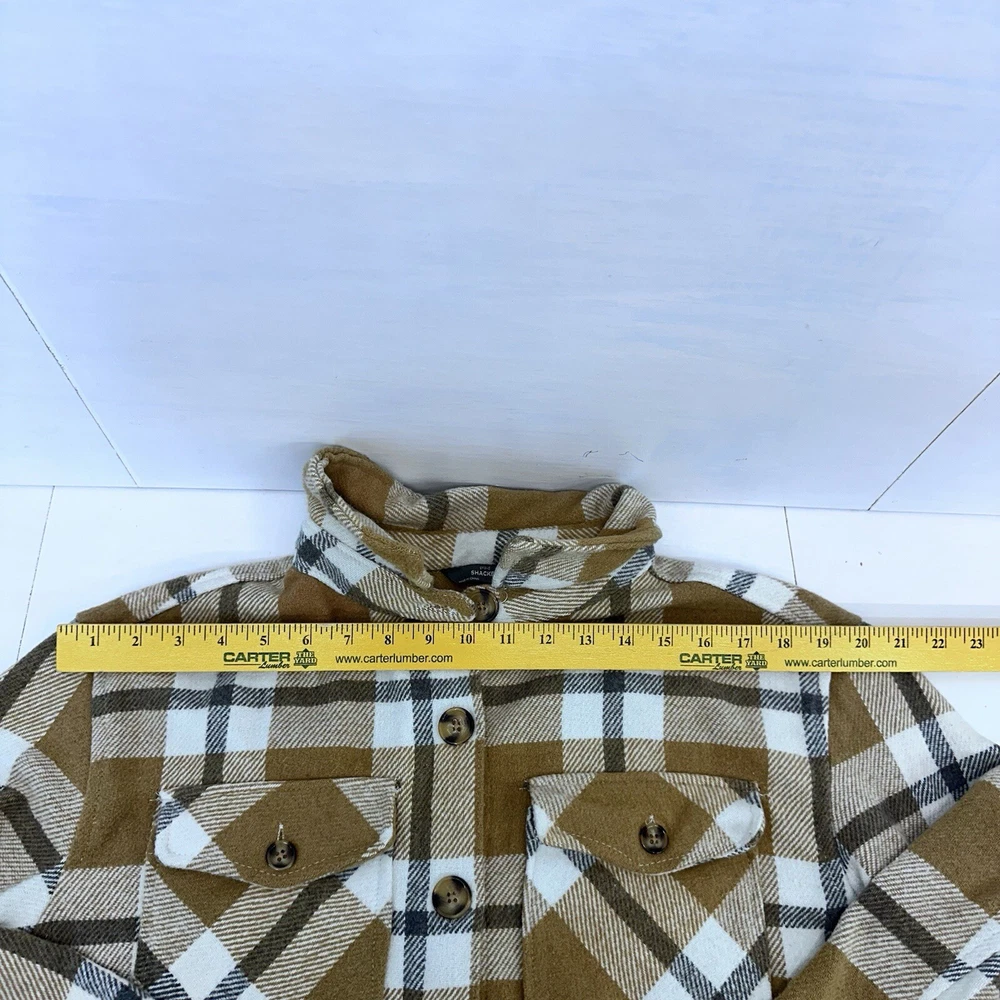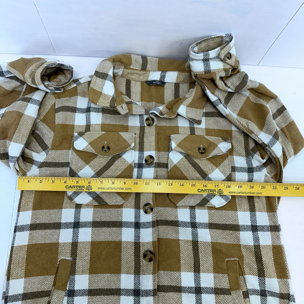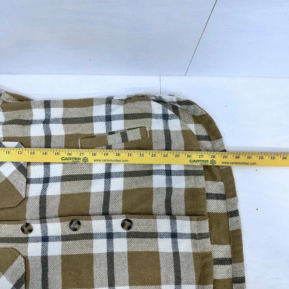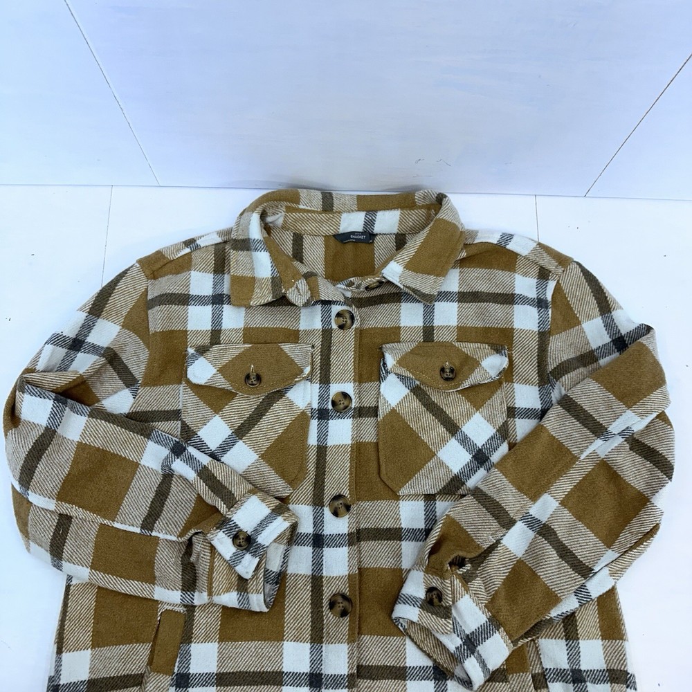 This Members Mark Plaid Shacket is a versatile piece perfect for any occasion. The brown/beige, white, and gray plaid pattern adds a stylish touch to this winter, fall, and spring mid-length jacket. The jacket features a collared neckline, button closure, and long sleeves with accents of buttons and pockets for added convenience. Crafted from a blended fabric of polyester, acrylic, rayon, nylon, and wool, this jacket is both comfortable and durable. It is machine washable and has a regular fit for easy wear. Whether you're traveling, attending a party, or just going about your day, this shacket is a great addition to your wardrobe. This is a preowned item, it comes to you in a preowned condition. Please see pictures for details and measurements to determine if the Shacket will fit you. All of our inventory comes from a smoke free, pet free work place. If you have any questions or concerns, feel free to message me .