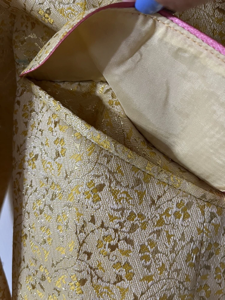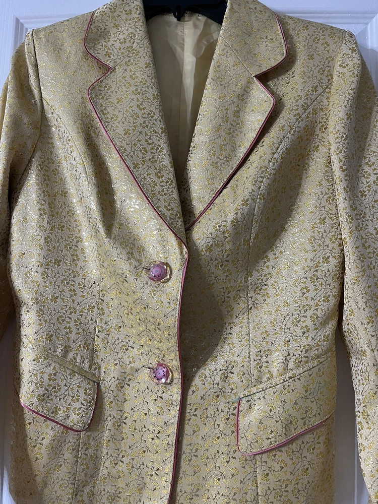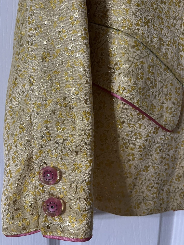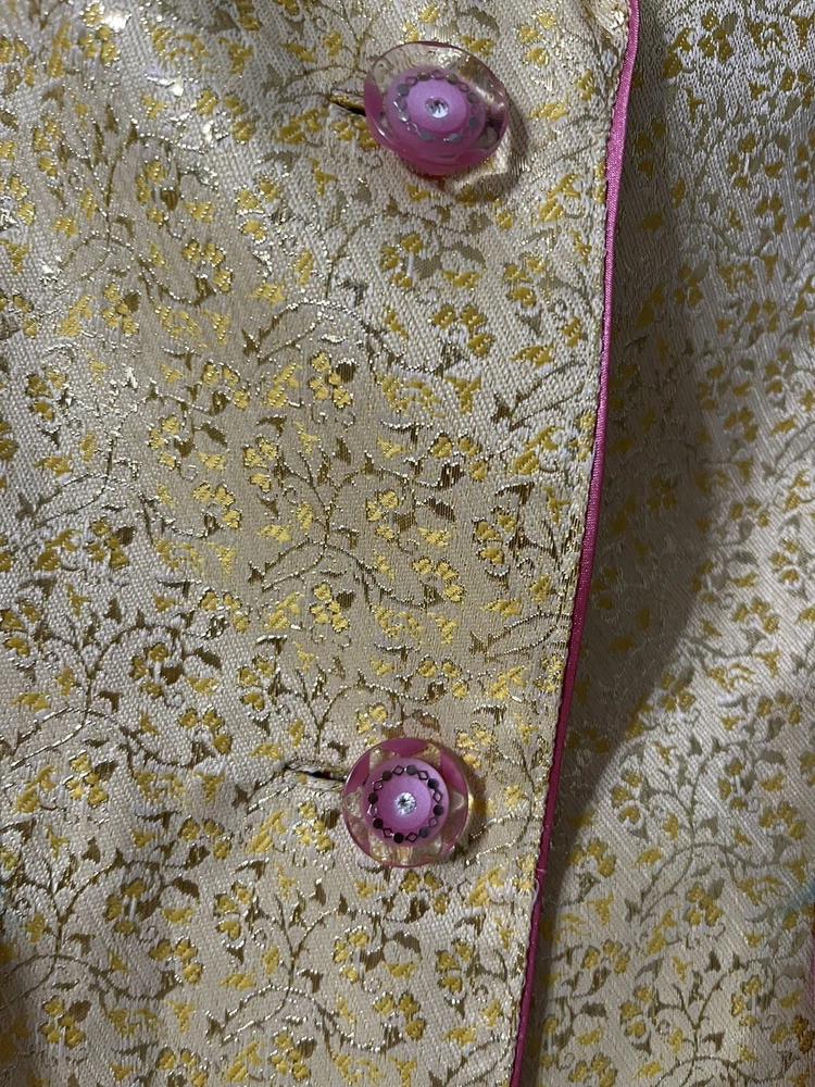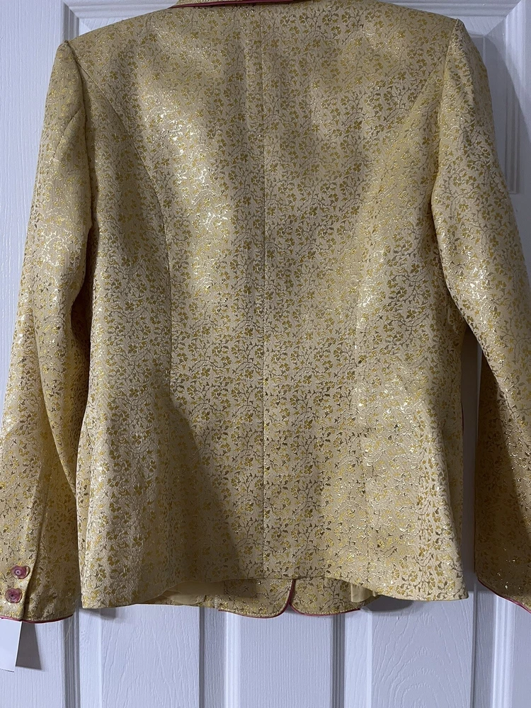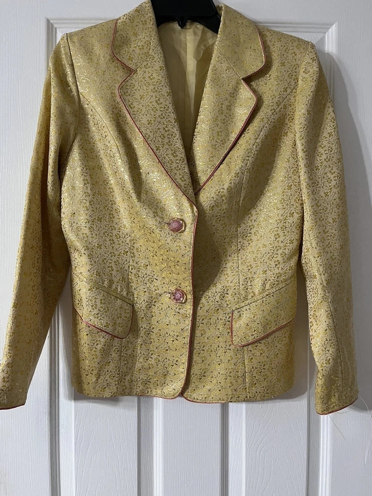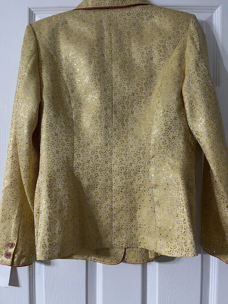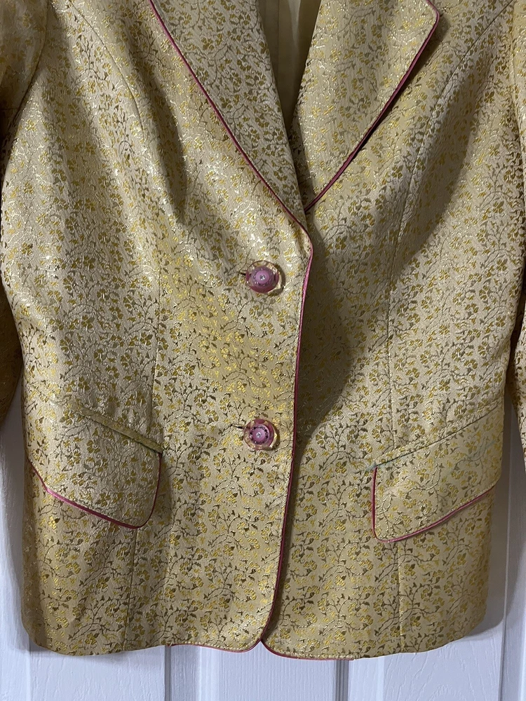 Women’s Medium Yellow Blazer Buttons Shape In Pink Flower Design Button Up. 2 front pockets, sleeves and front buttons have a pink flower shape, inside yellow lining, sleeve 23”, inseam 14”, length 24”, width 19” each side, jacket has no original tags, please verify measurements to ensure item fits.