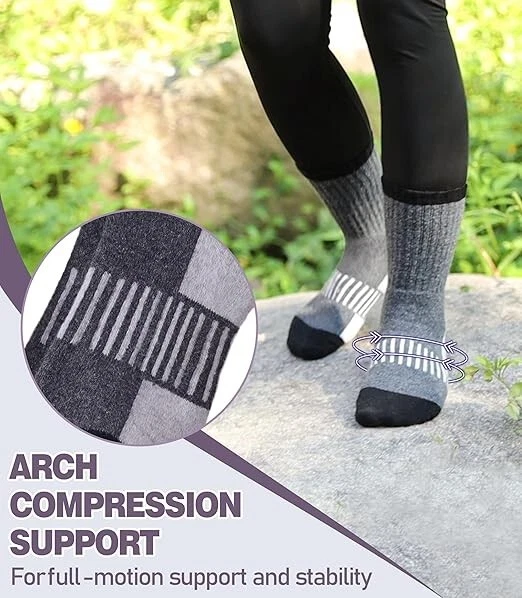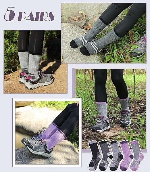 Womens Merino Wool Hiking Socks Thermal Warm Winter Boot Crew Socks Large Size Color: 5 Pairs Color Mix a Size: Large Fabric type70% Merino Wool, 23% Polyester, 5% Spandex, 2% Nylon Care instructionsHand Wash or Machine Wash on a Delicate Cycle OriginImported Pattern: Self Design SELECTED MATERIAL - These womens hiking crew socks made of 70% MERINO WOOL, 23% polyester, 5% spandex , 2% nylon.They can keep the temperature and warm up your feet in cold weather. TWO SIZE OPTIONS - DYW merino wool hiking socks have 2 sizes as options, Medium & Large .Medium Size fits for US women’s shoe size 5.5-10.Large Size fits for US women’s shoe size 10-13. A package includes 5 pairs womens warm socks at a value price.The value package with fashion colors are most women’s favorite. ELASTICITY - These warm hiking socks for womens have high elasticity and arch stripe,which can enhance the blood moving ,relieve symptoms varicose and keep socks stable.They can greatly improve your comfort in hiking , running , walking , climbing , trekking or everyday wear. Protection for Feet:These womens wool hiking crew socks have stretchy cuff and arch support ,which can improve the blood circulation and keep socks fit snugly.Cushion foot absorbs shock and reduces risk of blister.All of these provide more protection for women’s feet. GREAT GIFT CHOICE : Merino wool hiking socks are best present options for womens . They will be a surprise for your loved ones as birthday gift, Christmas gift, Mother’s Day gift, Valentine’s Day gift ,White Elephant Day gift. Return Policy: We offer a 30 day return policy from the receiving date. Please contact us for a Free Return Label. Please use our return label so it will go back to our supplier and we can do a refund or replacement afterwards. Feedback: Your satisfaction is very important to us! If you have any problem with your order, please contact us and we will do our very best to make you satisfied. As long as you are happy with your purchase, please leave a positive feedback for us. We will always leave you a positive feedback in return. If you have any problem with your purchase, please do not leave a negative feedback. Please Contact us ... and your issue will be solved quickly and positively We are a small family-owned business trying to make a living, not a huge company that does not care ... We will ALWAYS do our best for you!