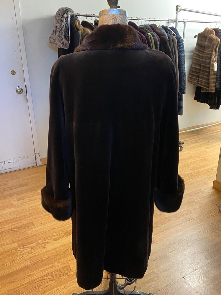 Dark Brown sheared mink stroller/car coat with long haired collar and cuffs. Fits a size 12/14; Length from shoulder to hem is 38"; Sleeve length from shoulder is 29"; lining is silk, closures are elastic loops with buttons; sweep/swing is 60". Name embroidered inside (it can be removed), Worn once. In excellent condition. Comes from a pet-free; smoke-free home. Would make a fabulous gift. CATEGORY Women Jackets & Coats