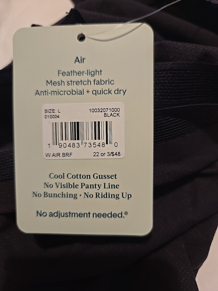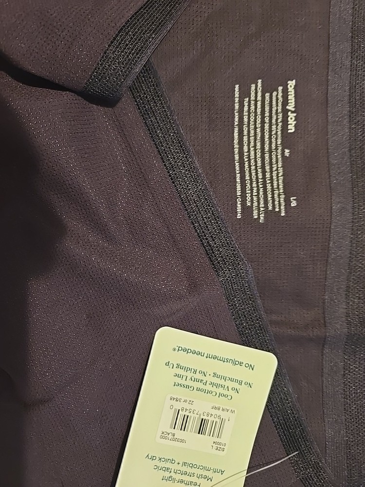 Type:PantiesMaterial:Nylon BlendModel:Tommy John Air Mesh Brief PantyFeatures:Breathable, Lightweight, Moisture Wicking, Tagless, No Panty LinesColor:BlackNumber in Pack:1 PackGarment Care:Machine WashableDepartment:WomenOpacity:OpaqueSize Type:RegularAccents:LogoStyle:BriefCountry/Region of Manufacture:EgyptVintage:NoFabric Type:Blended FabricBrand:Tommy JohnPattern:SolidSize:L