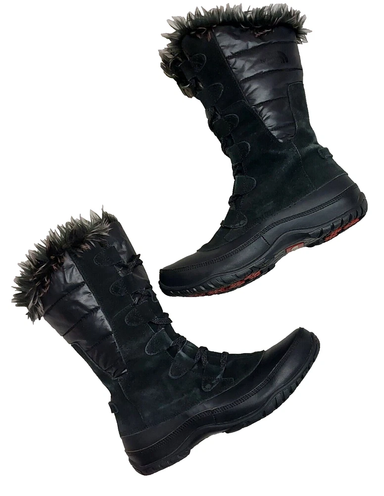 Women's The North Face Nuptse Purna Black Waterproof Boots Faux Fur Trim Size 7. Features Primaloft 200 Gram Insulation, full front lace-up closure, warm black microfleece interior with faux fur trim and rubber outsoles. Please note there are some creases and fading on the outside of the boots due to normal wear. There is a minimal wear on soles/treads. Well constructed and still a great pair of winter boots! Ships USPS Standard Mail.