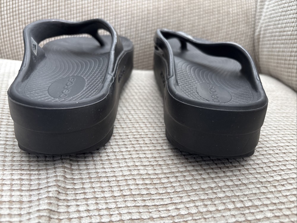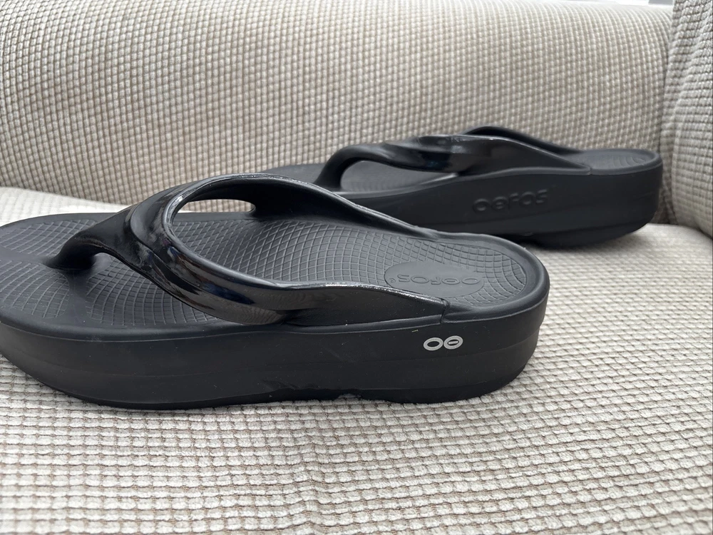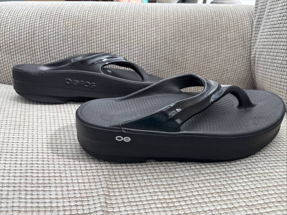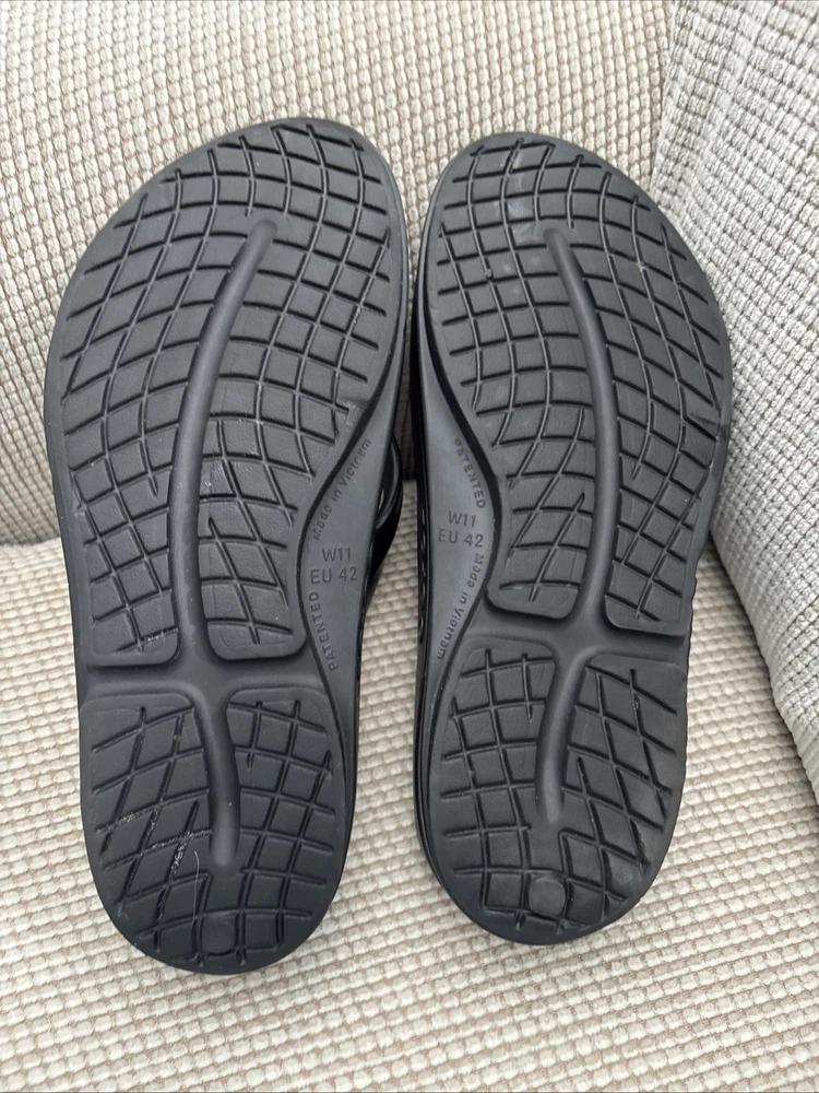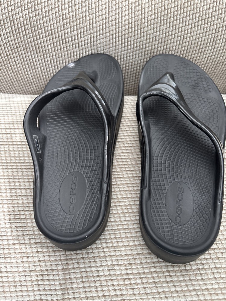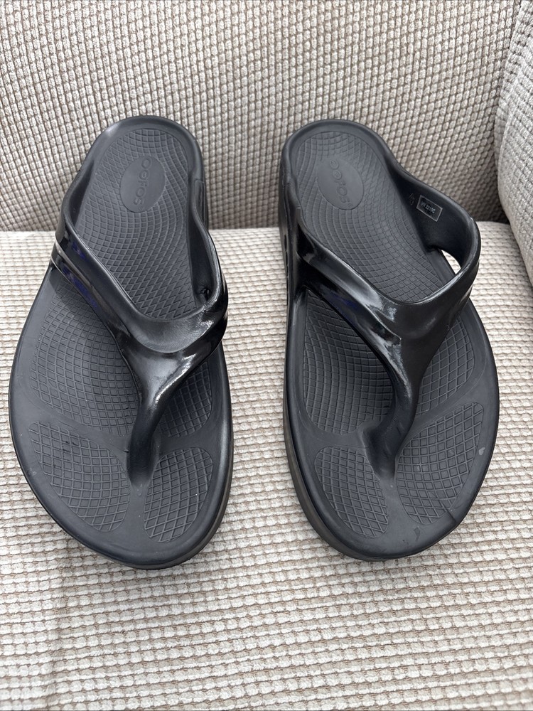 The Women's OOFOS Thong Sandals are in black, size 11, featuring a slip-on style with a solid pattern and logo accents. These comfortable flip-flops are designed for casual wear and are made with a breathable synthetic upper material. The OOFOS sandals are part of the Comfort Plus product line, ideal for providing comfort and support for recovery after physical activity or for everyday use.