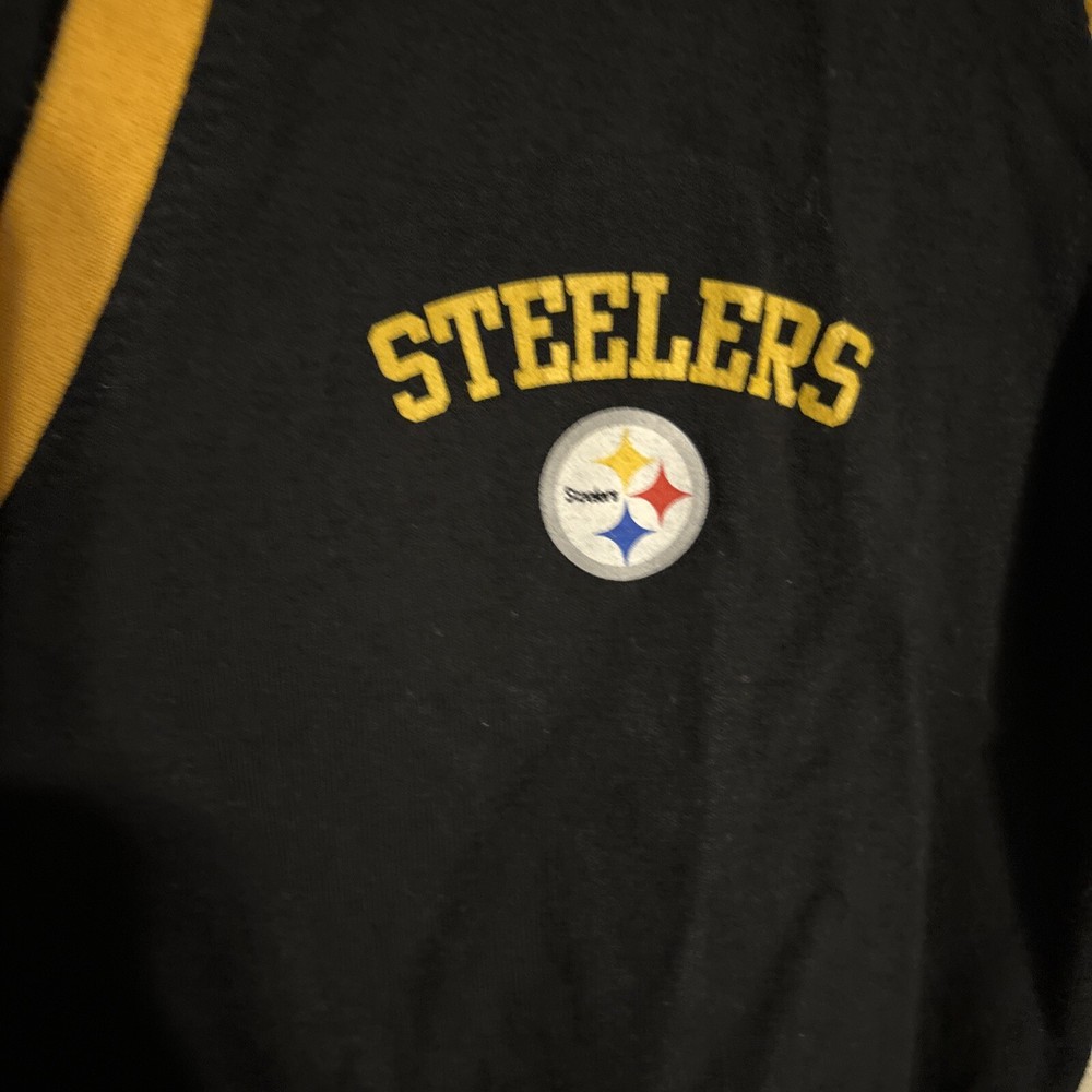 Show your love for the Pittsburg Steelers with this stylish black and gold blouse. Perfect for game day or any day, this shirt features the team's iconic logo and is made from comfortable cotton material. The V-neckline and regular size make it a great choice for any woman, while the V-neckline and basic style make it a versatile addition to any wardrobe. Whether you're cheering from the stands or watching from home, this shirt is sure to show your support for one of the greatest teams in NFL history. W23 International charges are the buyer's responsibility. No international returns.