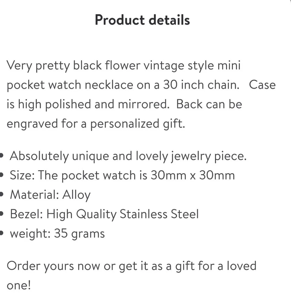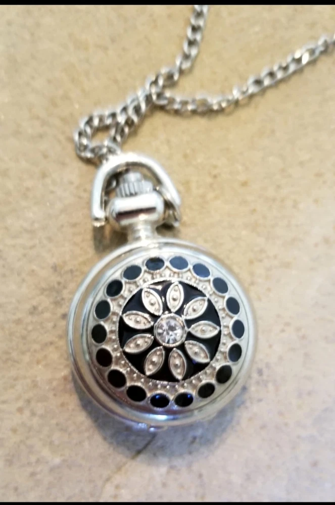 This silver tone pocket watch necklace is in new condition. The pendant shape is round and the necklace length is 30 inches with a lobster closure. The pendant/locket type also has a place for a special photo. Operating Instructions: The watch opens by pressing down on the crown knob. Basic quartz pocket watches operate just like standard quartz wrist watches. To set the time, pull the crown all the way out (or second detent). Push the crown all the way back in to start the movement and begin normal time keeping.