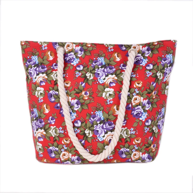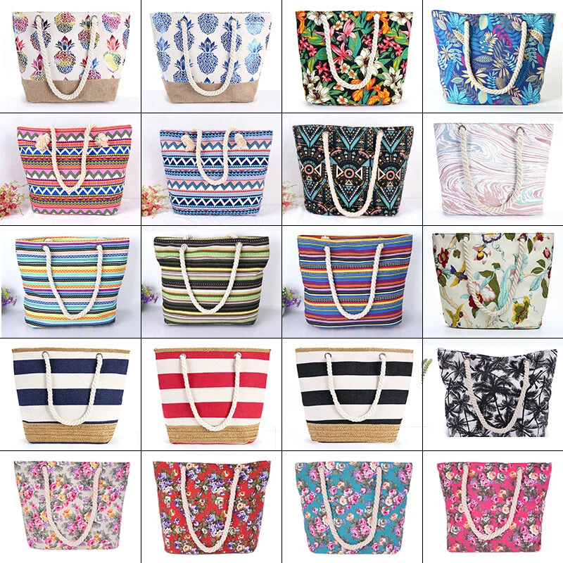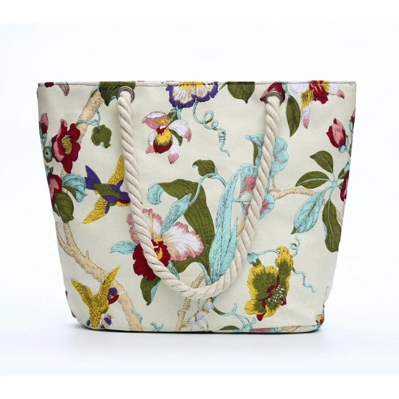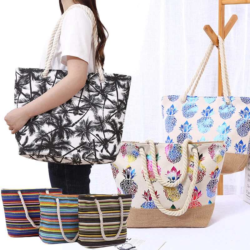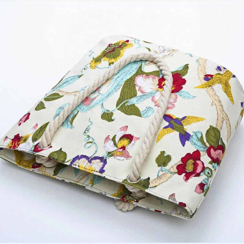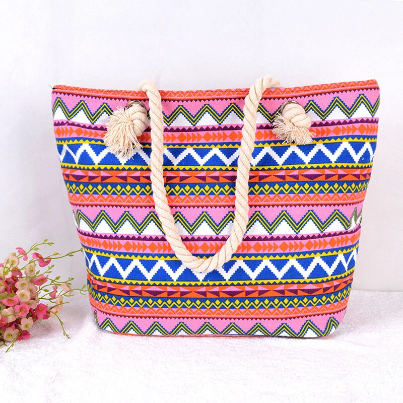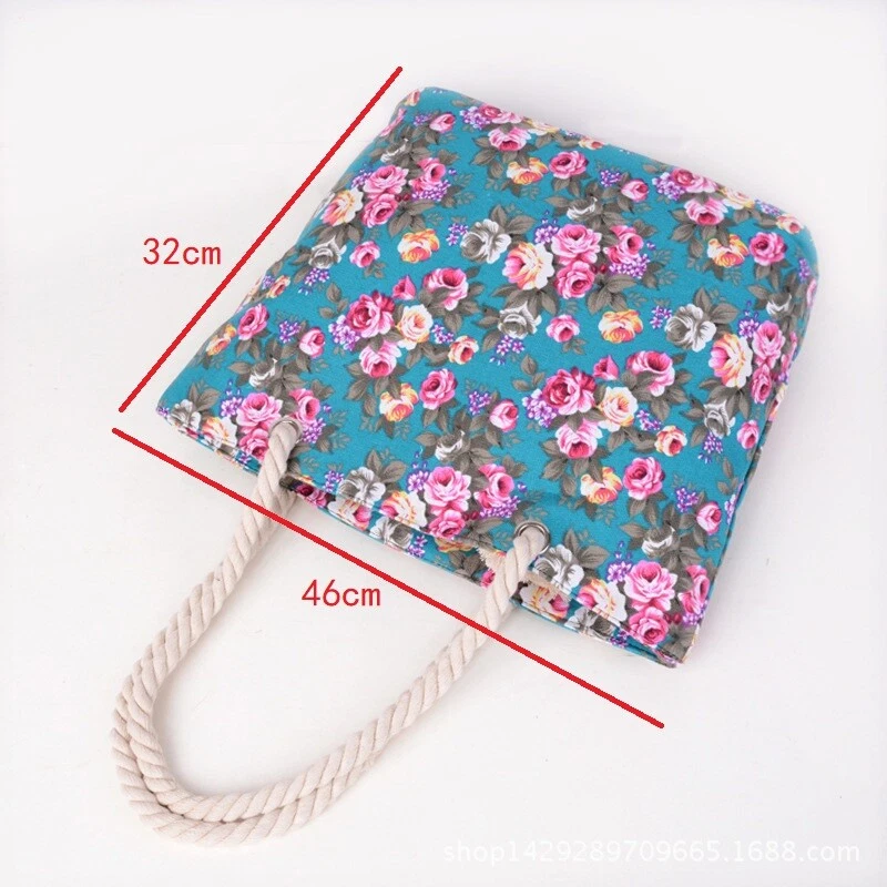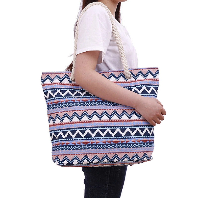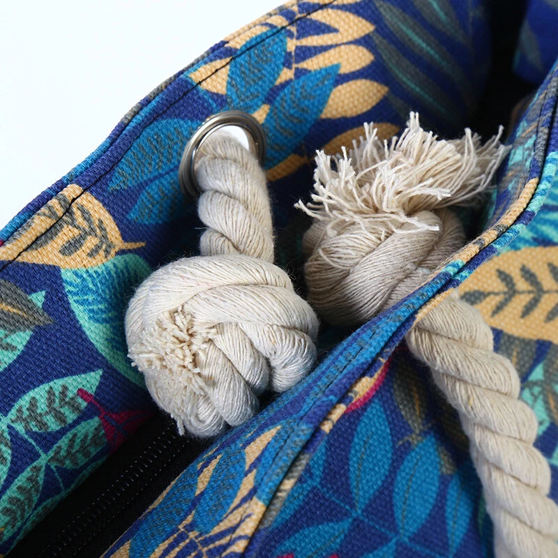Womens Print Cotton Rope Shoulder Strap Handbag Large Capacity Beach Tote Bags