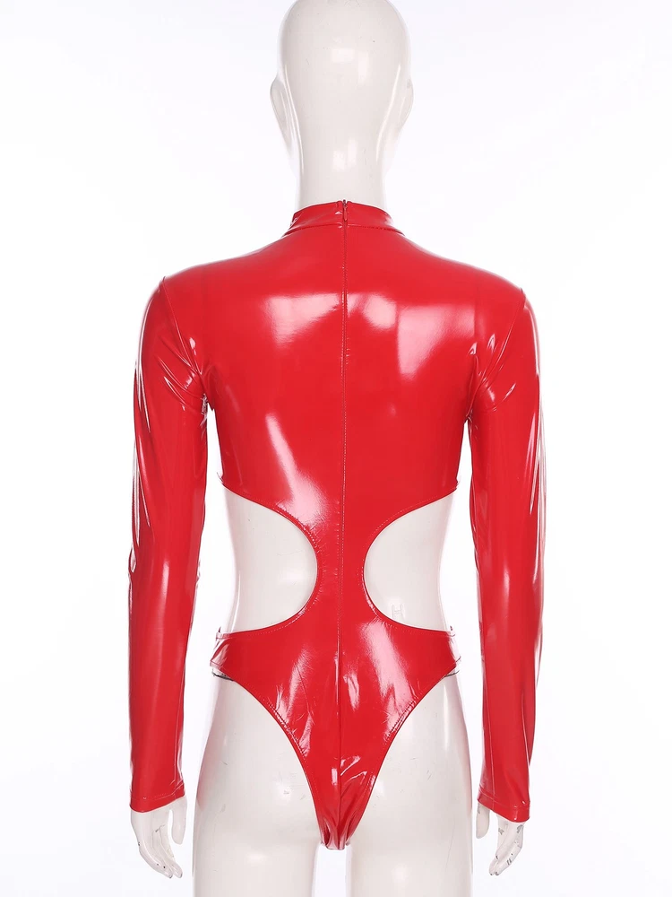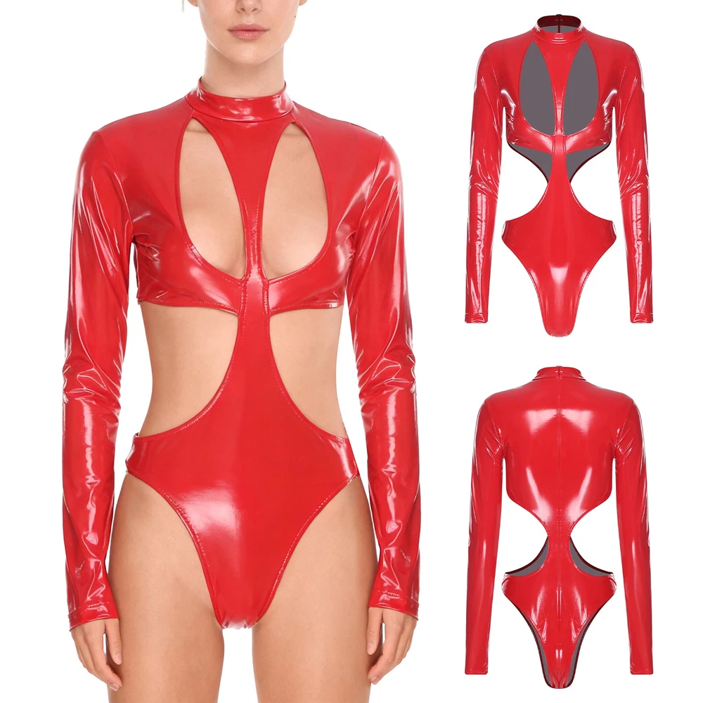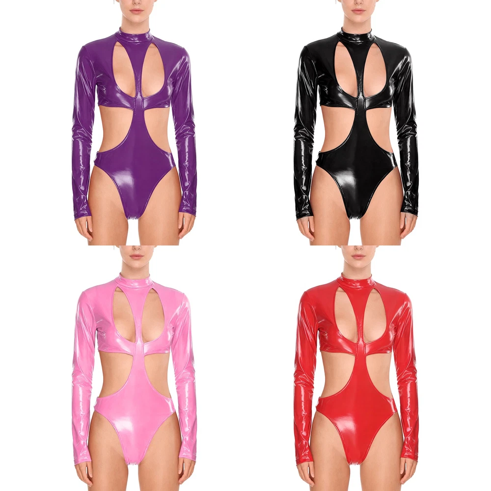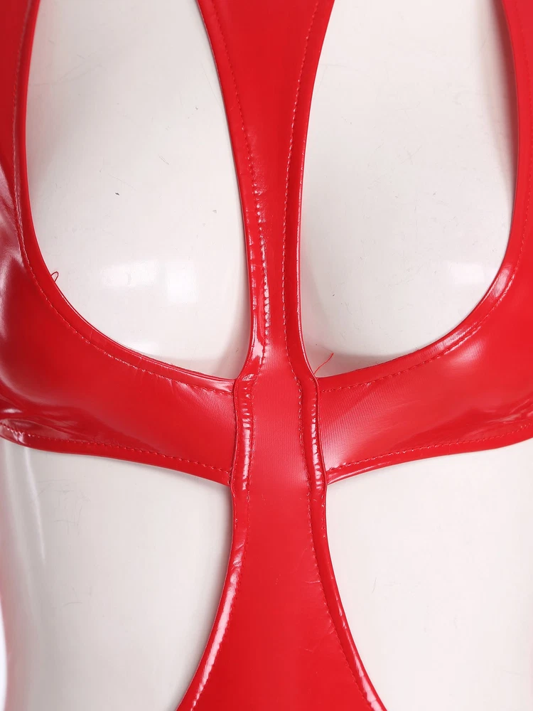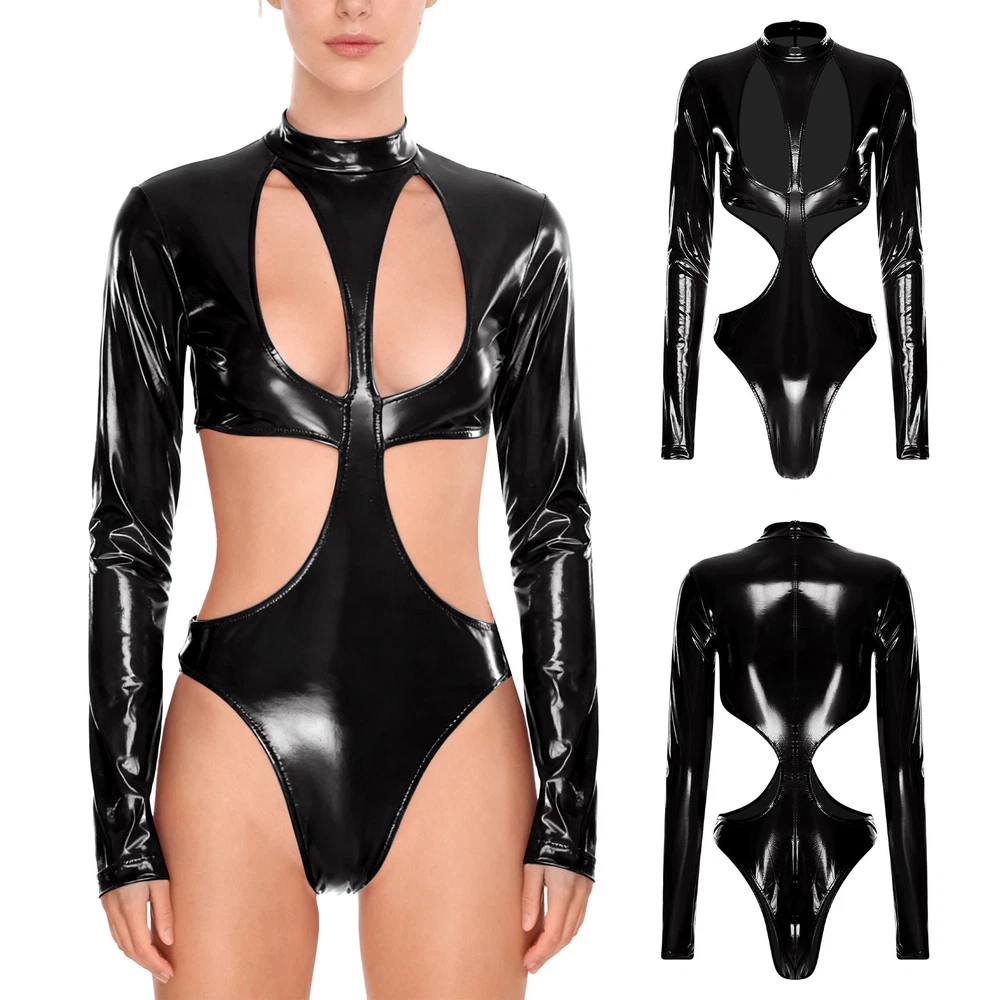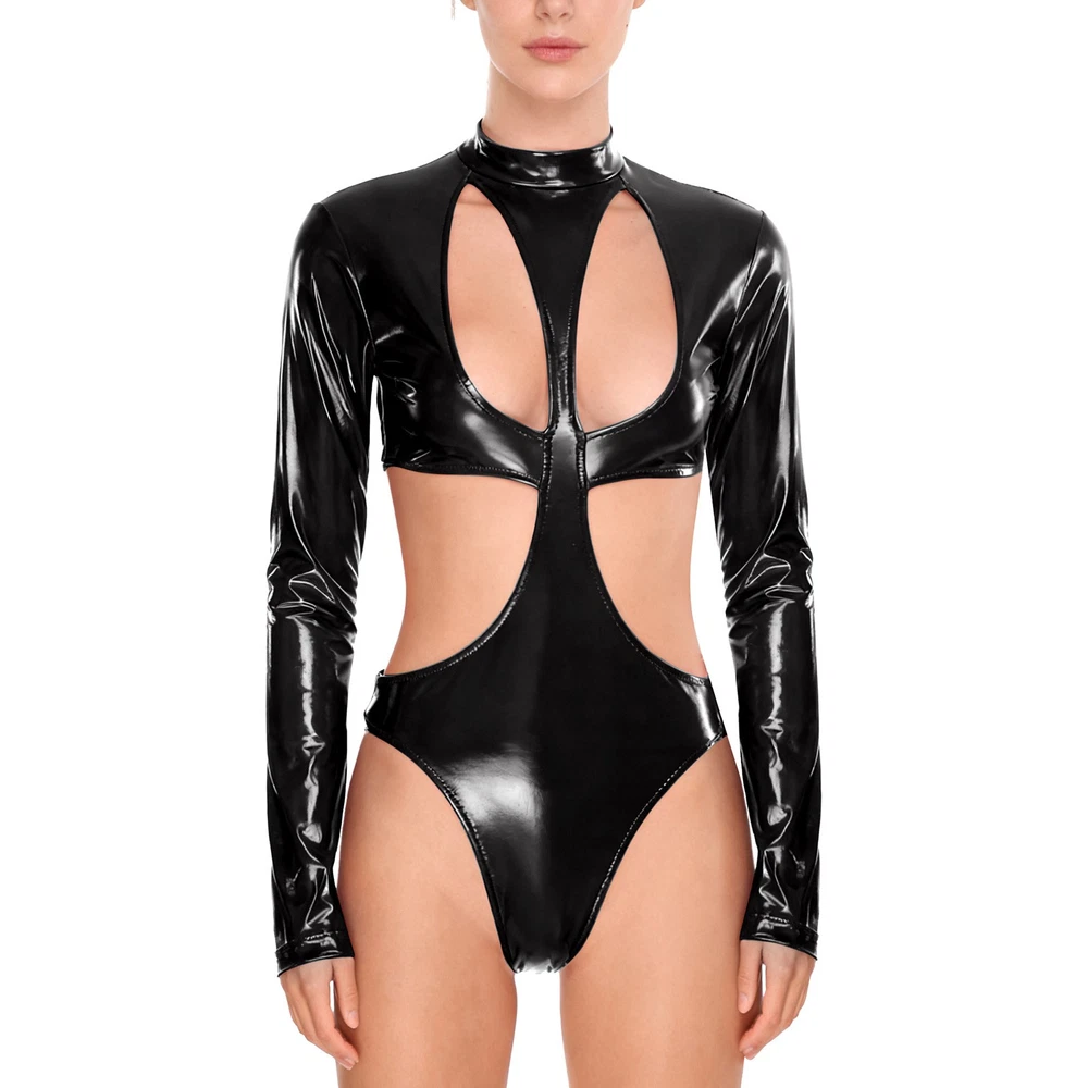 Womens Pu Leather Bodysuit Outfit Hollow Out Teddy Leotard Wet Look Catsuit
