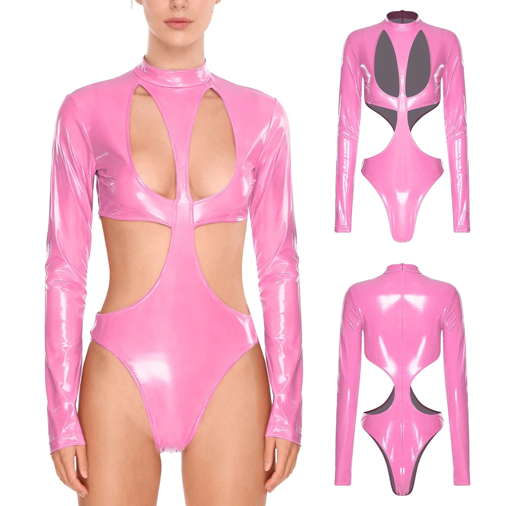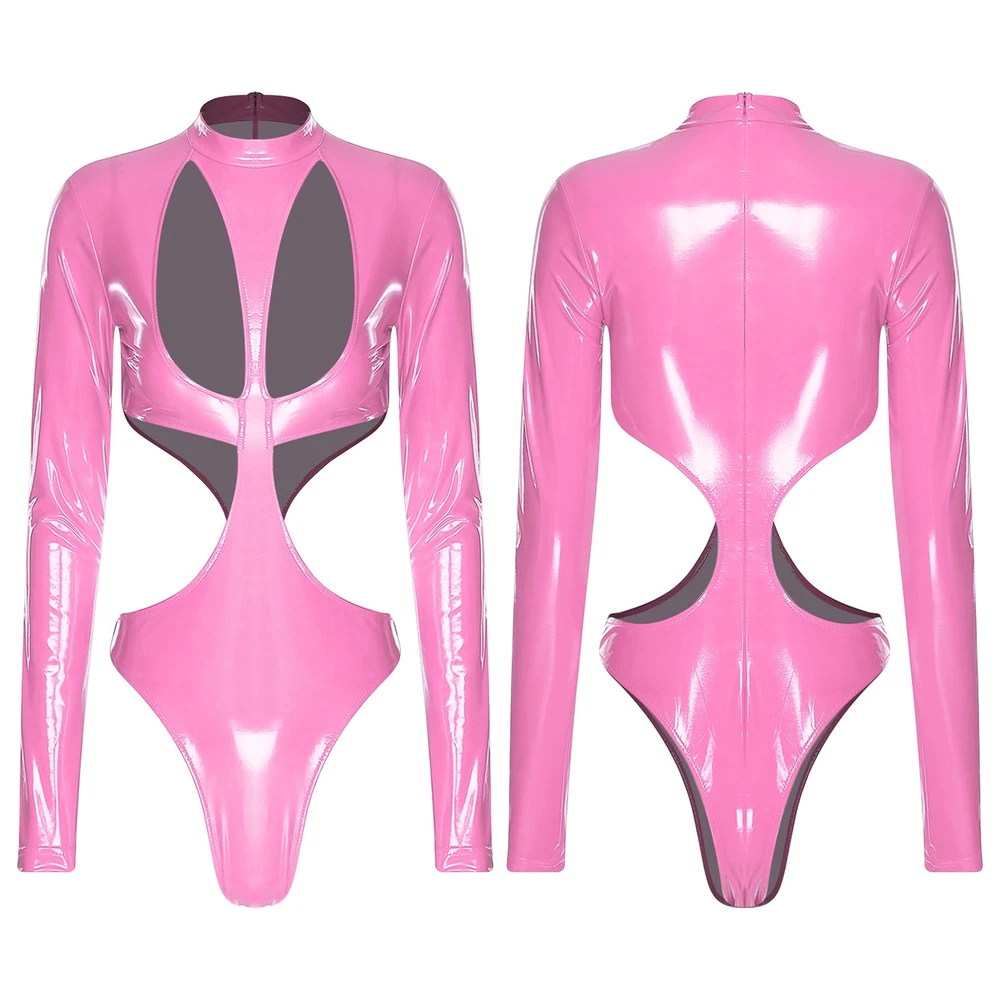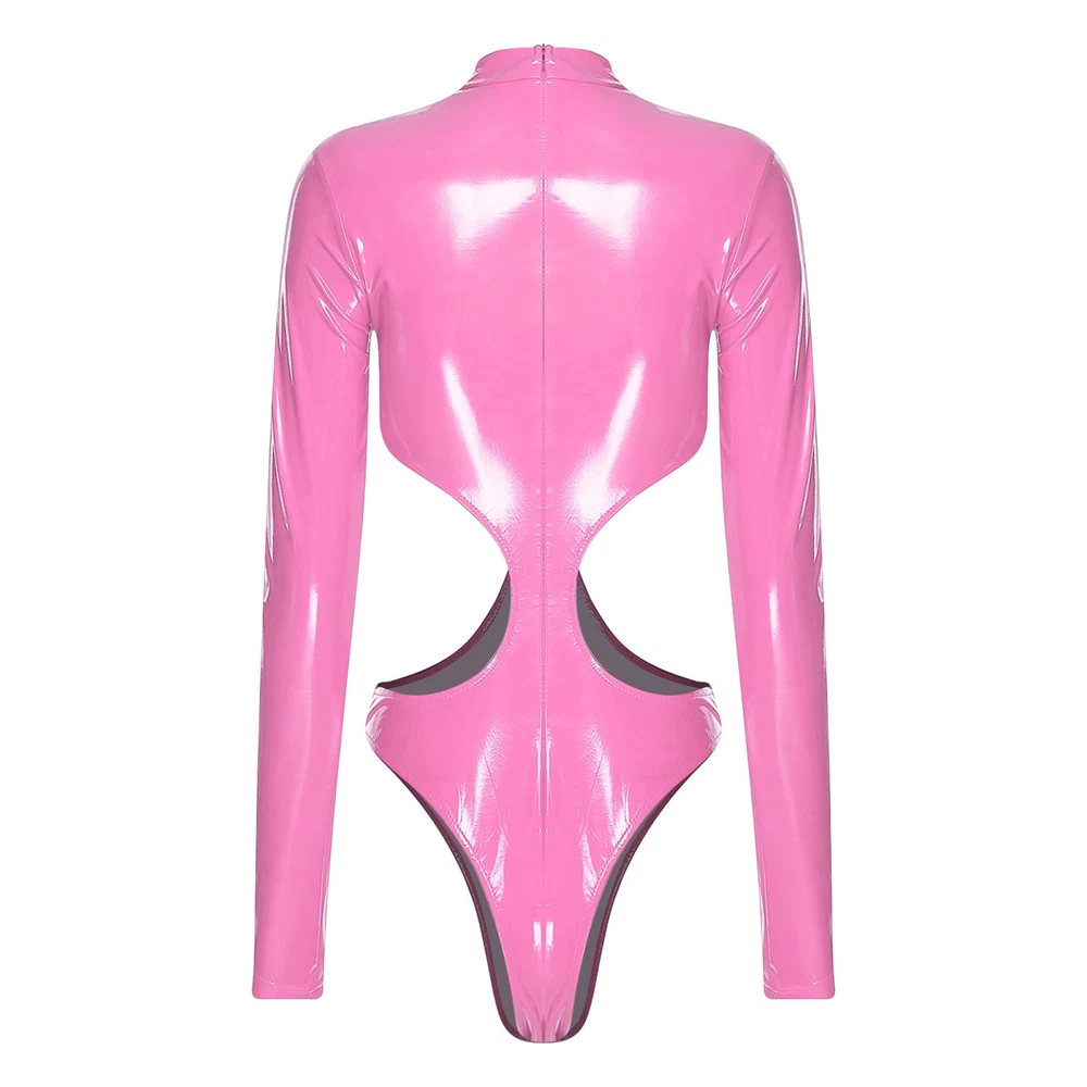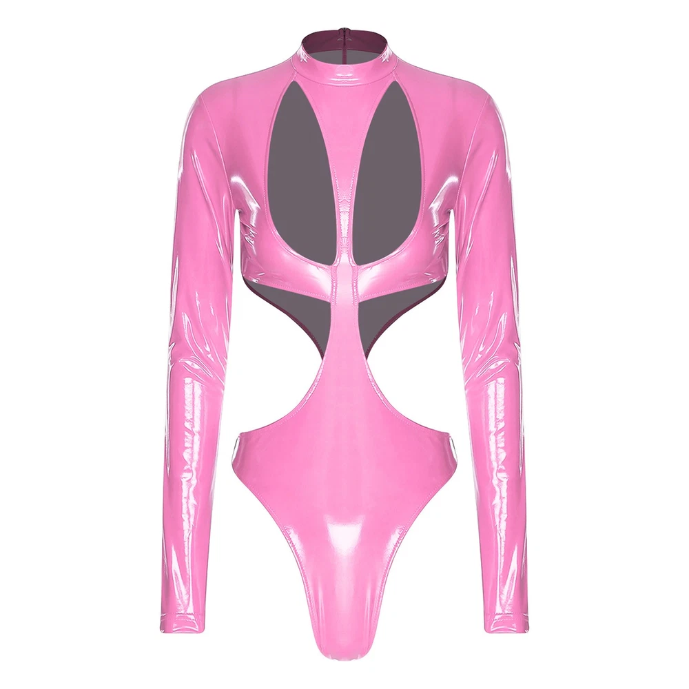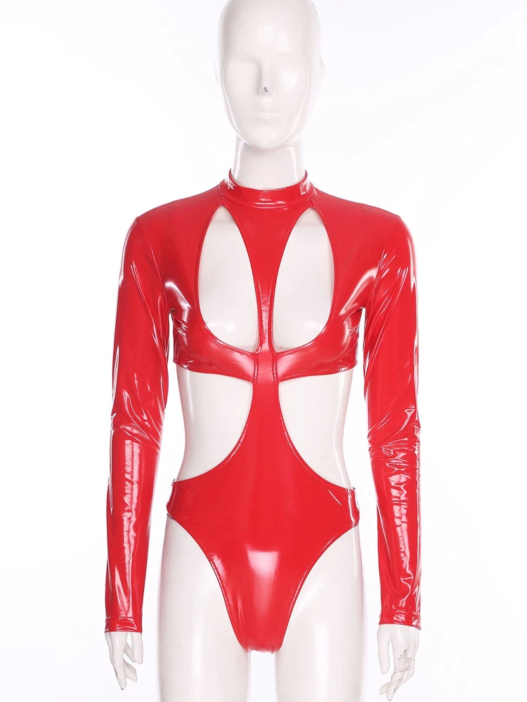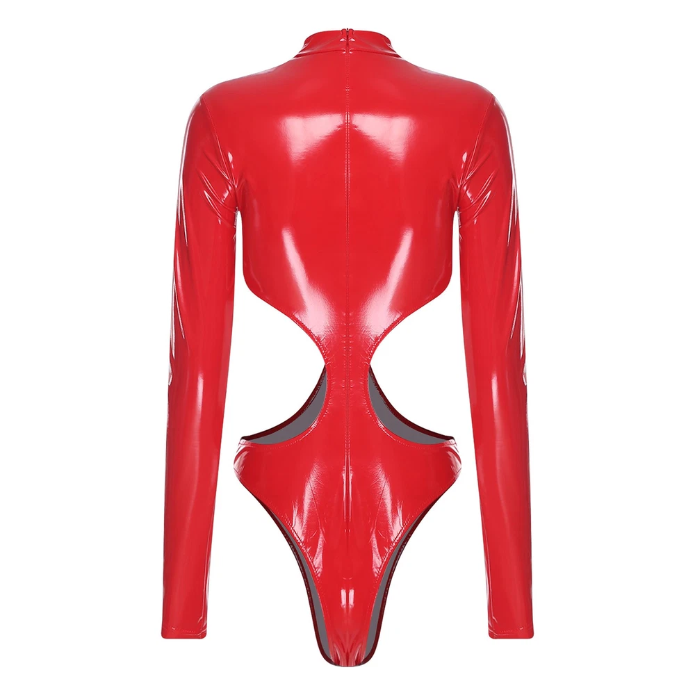 Womens Pu Leather Bodysuit Outfit Hollow Out Teddy Leotard Wet Look Catsuit