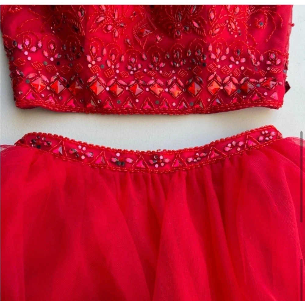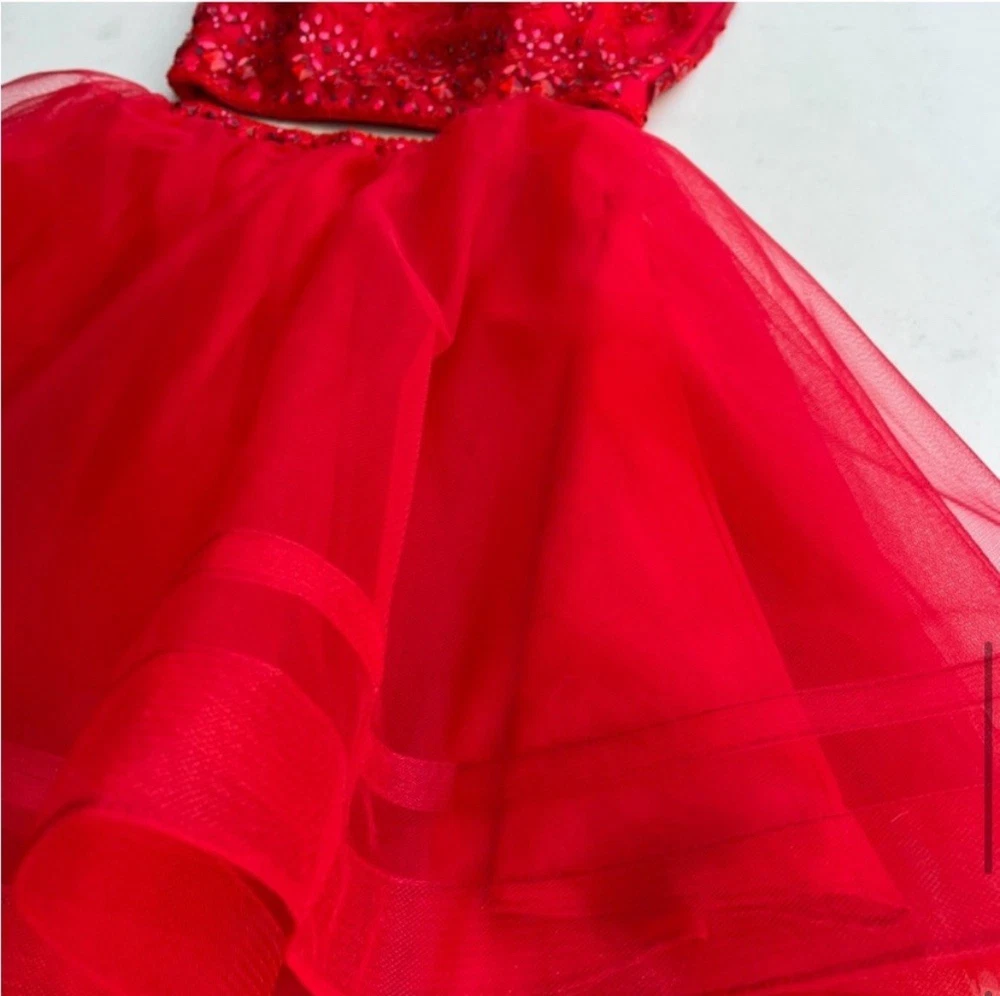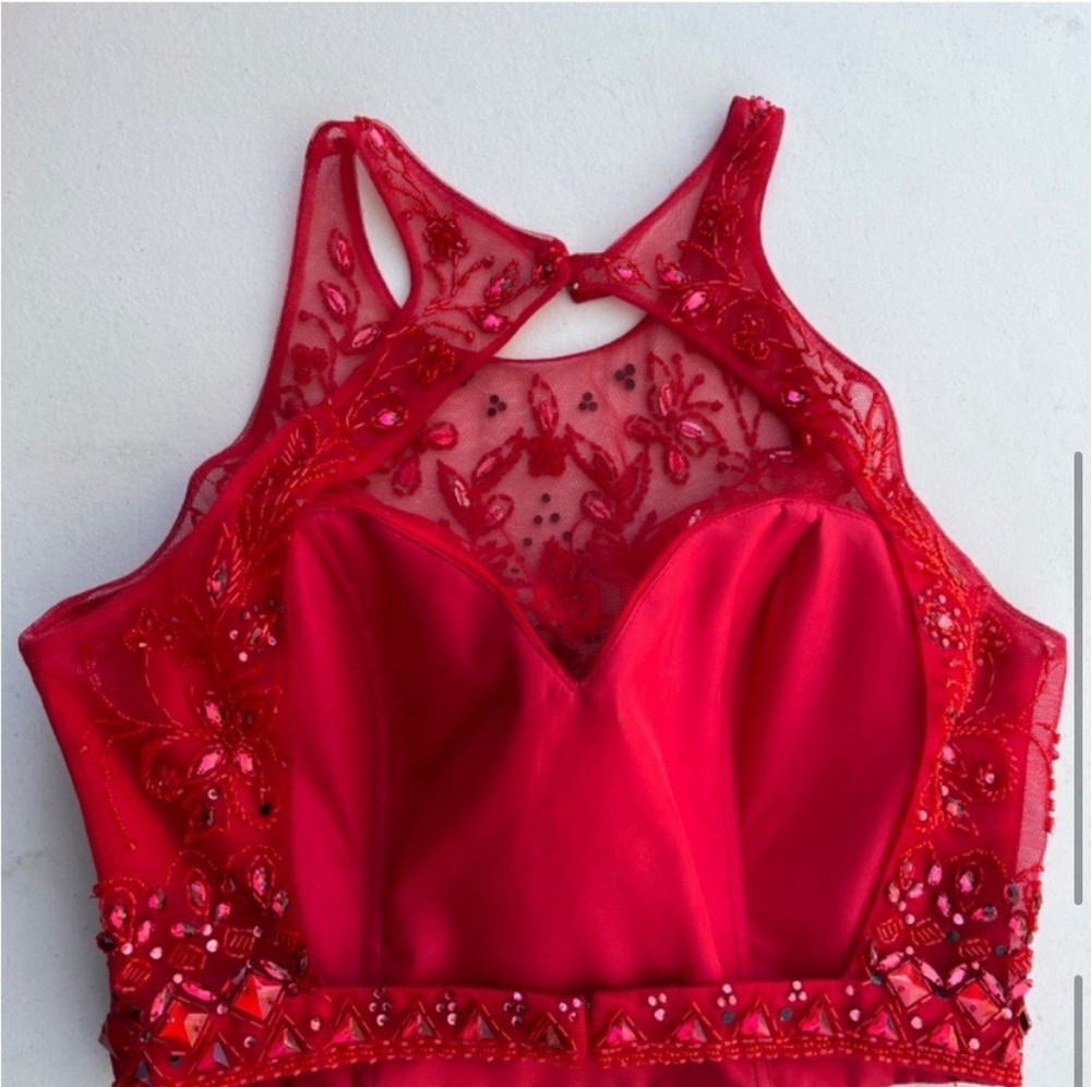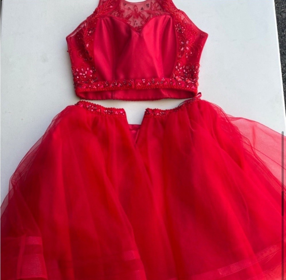 Women’s Two-Piece Beaded Corset Dress Stand out at your next special event with this dazzling two-piece formal set, perfect for prom, homecoming, or a pageant. This outfit includes a gorgeous halter-style lace crop top and a voluminous tulle mini skirt, both beautifully embellished with red and iridescent rhinestones. Key Features: • Style Number: FY8796 • Size: 2 • Color: Red • Top: Halter neck lace crop top with sheer illusion mesh and built-in structured cups • Beading: Intricate red sequin and rhinestone embellishments on both top and skirt waistband • Skirt: High-waisted red tulle skirt with layered volume and matching beaded waistband • Closure: Zippers on both pieces (rear for top and skirt) • Condition: Excellent pre-owned condition; clean and free of visible flaws or snags