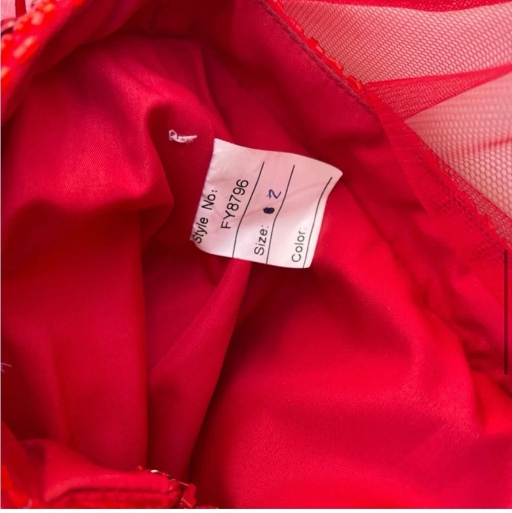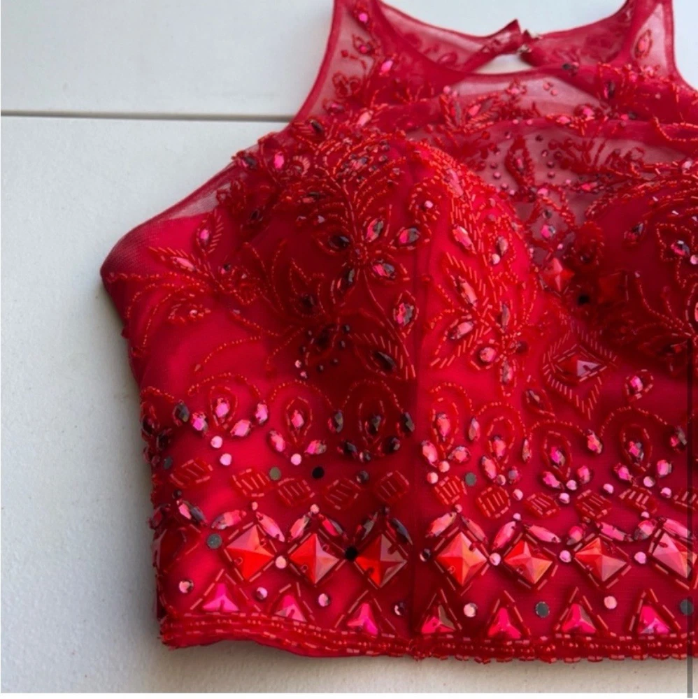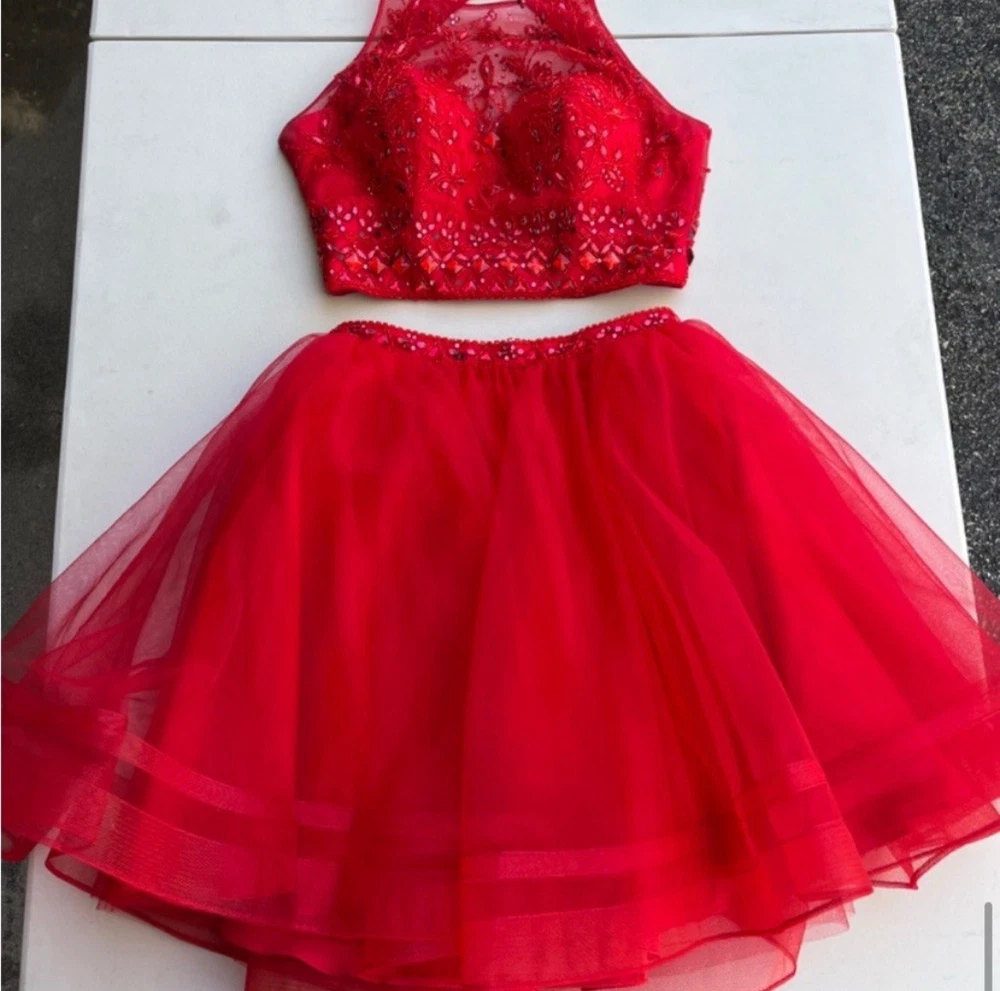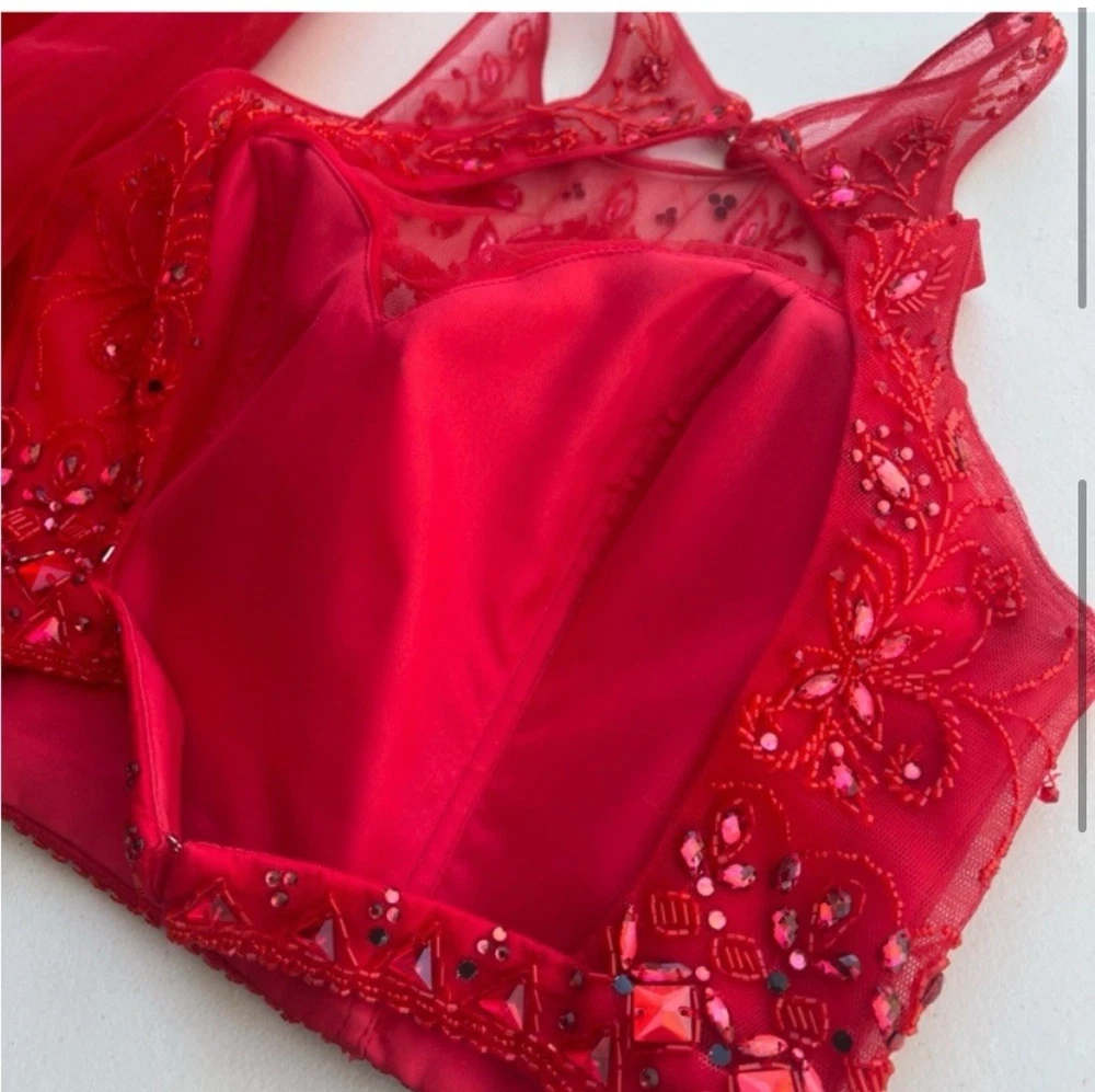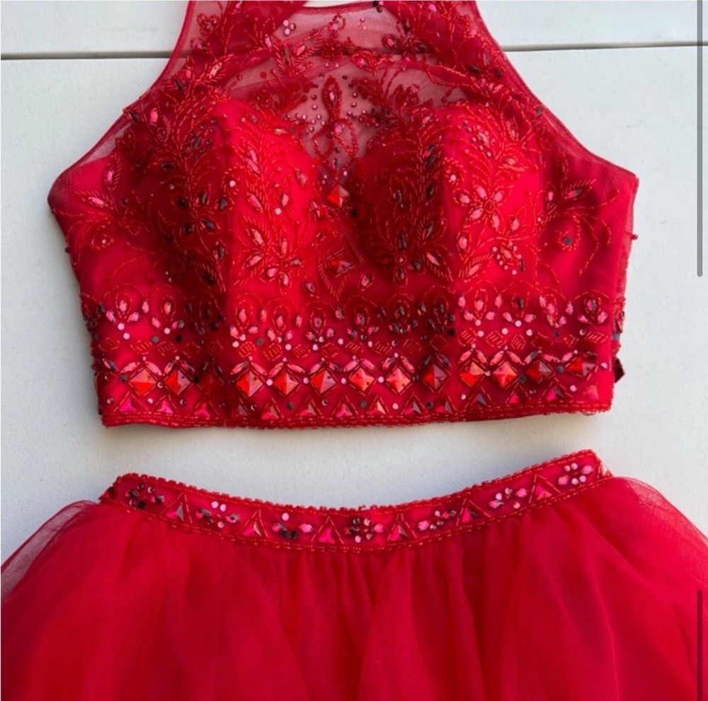 Women’s Two-Piece Beaded Corset Dress Stand out at your next special event with this dazzling two-piece formal set, perfect for prom, homecoming, or a pageant. This outfit includes a gorgeous halter-style lace crop top and a voluminous tulle mini skirt, both beautifully embellished with red and iridescent rhinestones. Key Features: • Style Number: FY8796 • Size: 2 • Color: Red • Top: Halter neck lace crop top with sheer illusion mesh and built-in structured cups • Beading: Intricate red sequin and rhinestone embellishments on both top and skirt waistband • Skirt: High-waisted red tulle skirt with layered volume and matching beaded waistband • Closure: Zippers on both pieces (rear for top and skirt) • Condition: Excellent pre-owned condition; clean and free of visible flaws or snags