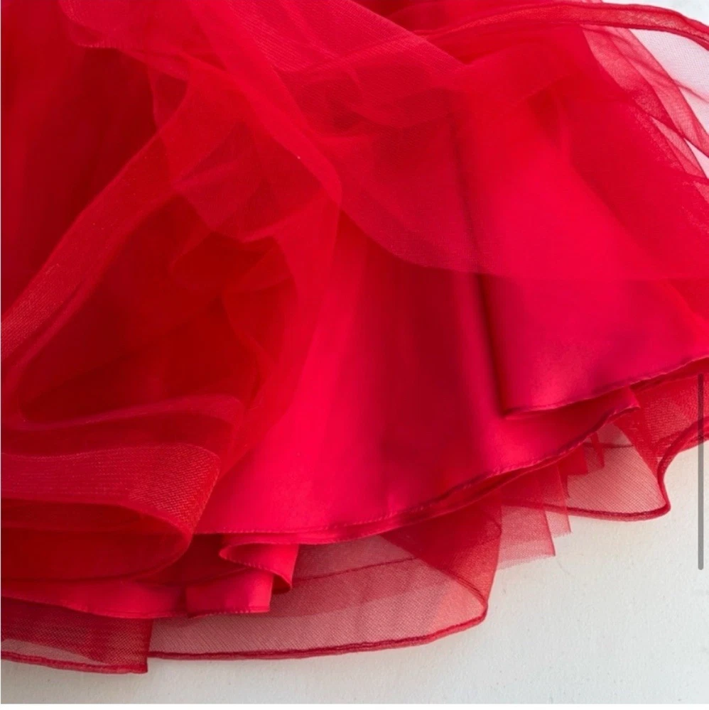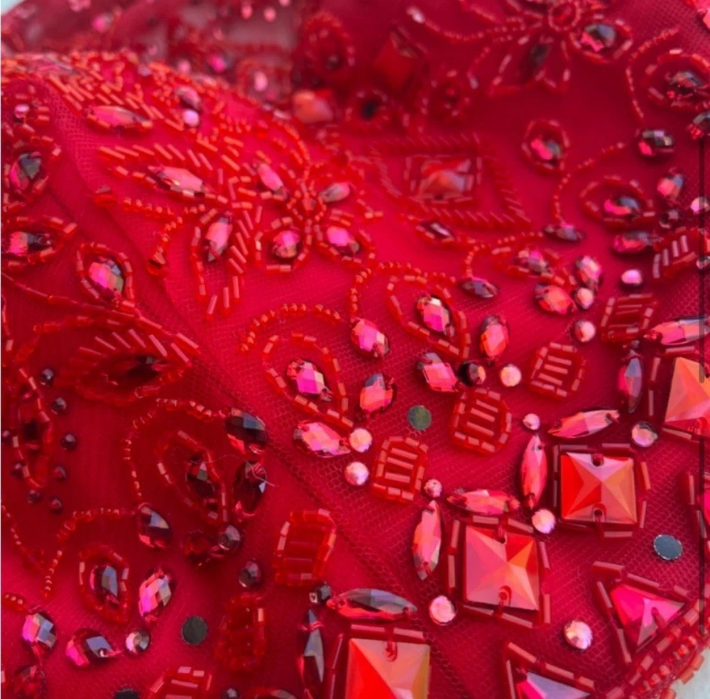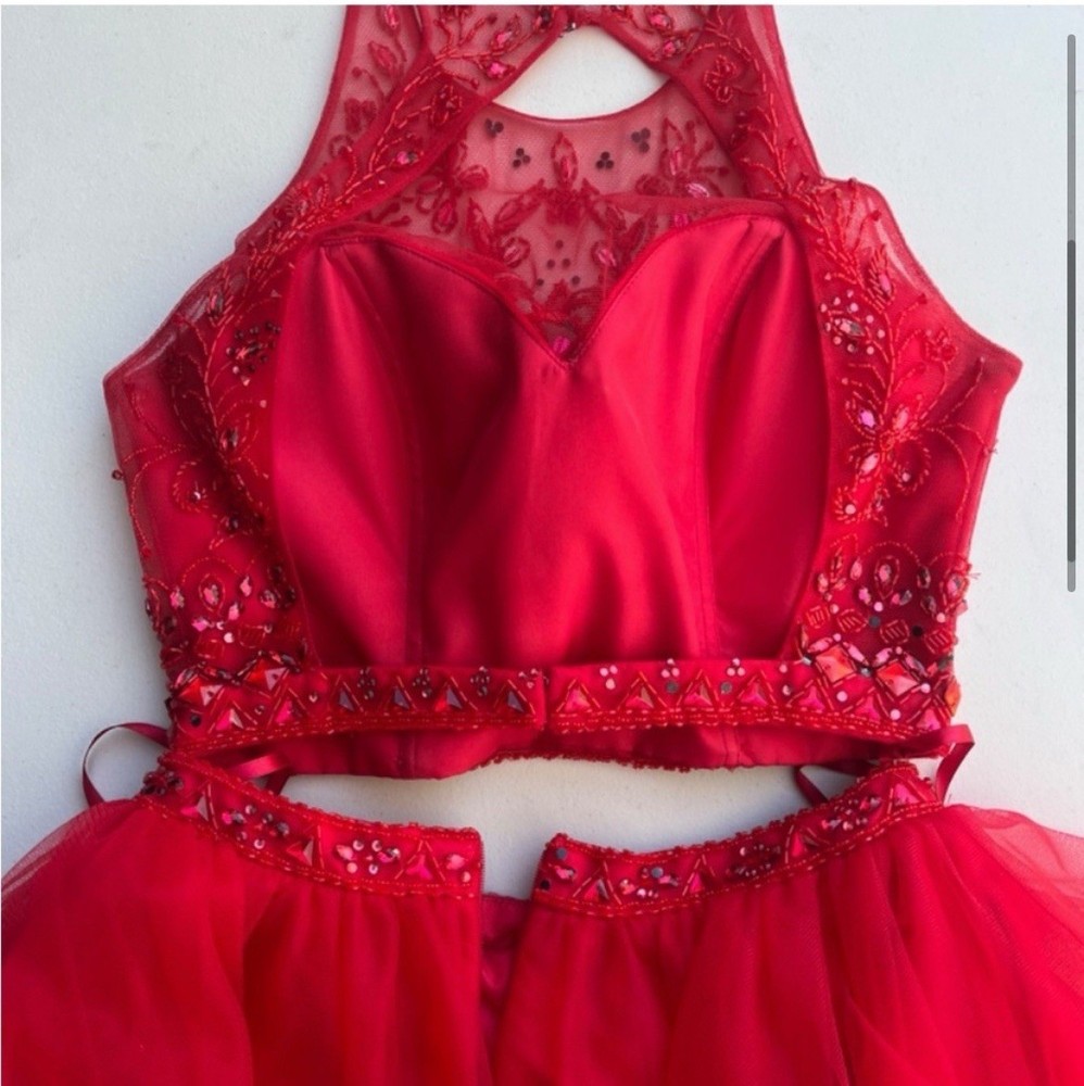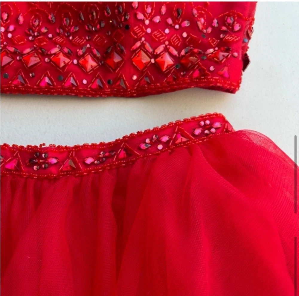 Women’s Two-Piece Beaded Corset Dress Stand out at your next special event with this dazzling two-piece formal set, perfect for prom, homecoming, or a pageant. This outfit includes a gorgeous halter-style lace crop top and a voluminous tulle mini skirt, both beautifully embellished with red and iridescent rhinestones. Key Features: • Style Number: FY8796 • Size: 2 • Color: Red • Top: Halter neck lace crop top with sheer illusion mesh and built-in structured cups • Beading: Intricate red sequin and rhinestone embellishments on both top and skirt waistband • Skirt: High-waisted red tulle skirt with layered volume and matching beaded waistband • Closure: Zippers on both pieces (rear for top and skirt) • Condition: Excellent pre-owned condition; clean and free of visible flaws or snags