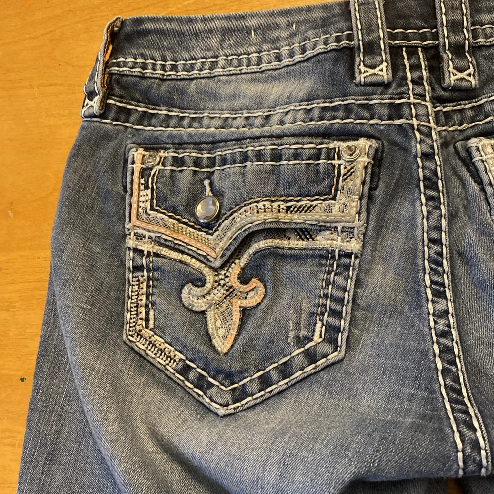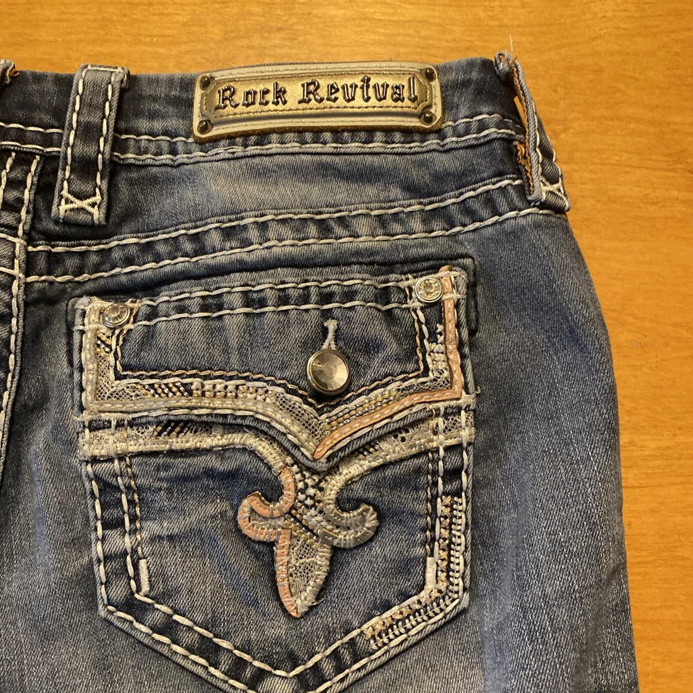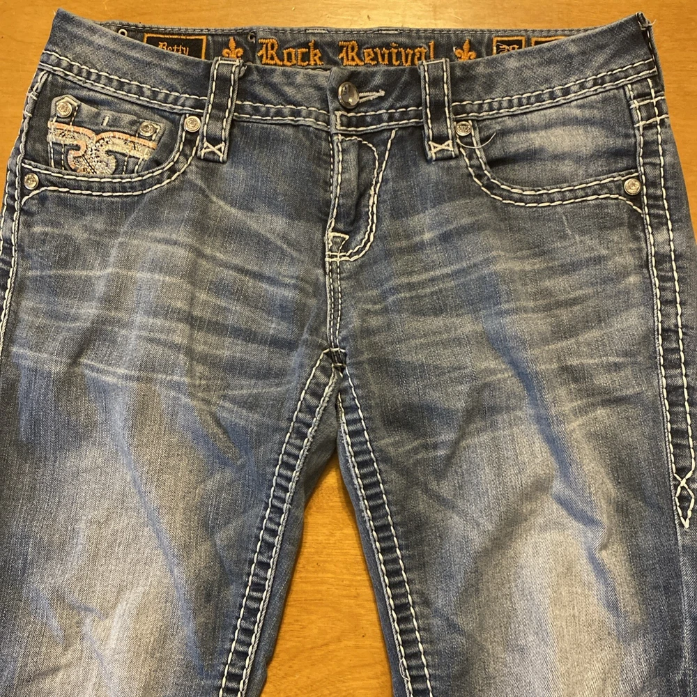 Elevate your denim game with these stunning Rock Revival jeans in size 28. The Betty Bootcut style features a flattering mid-rise fit with a zip and button closure. The jeans are made of a comfortable blend of polyester, viscose, cotton, and elastane that provides a stretchy fit with pockets for added convenience. These are pre owned jeans please look over pictures and measurements