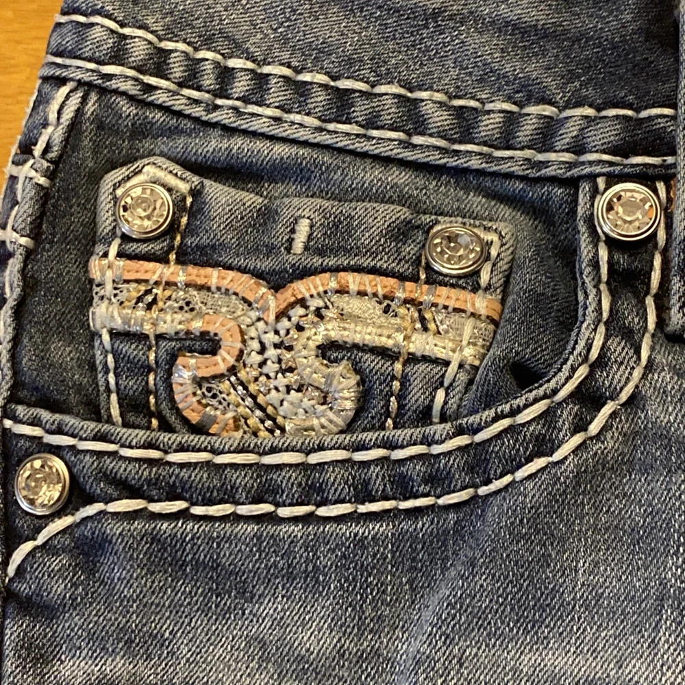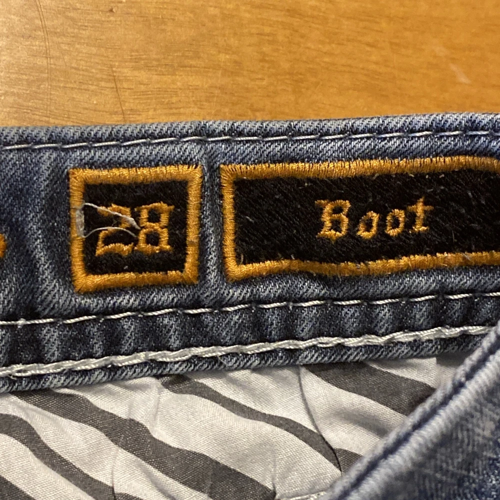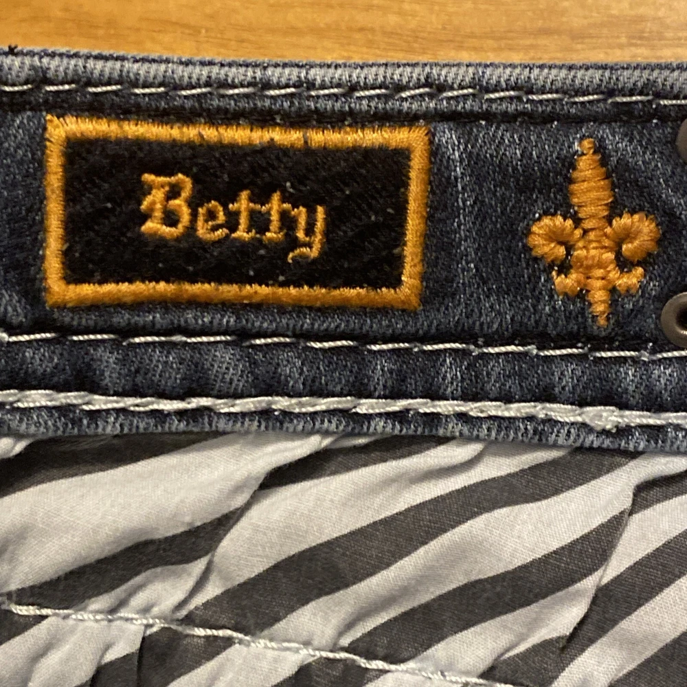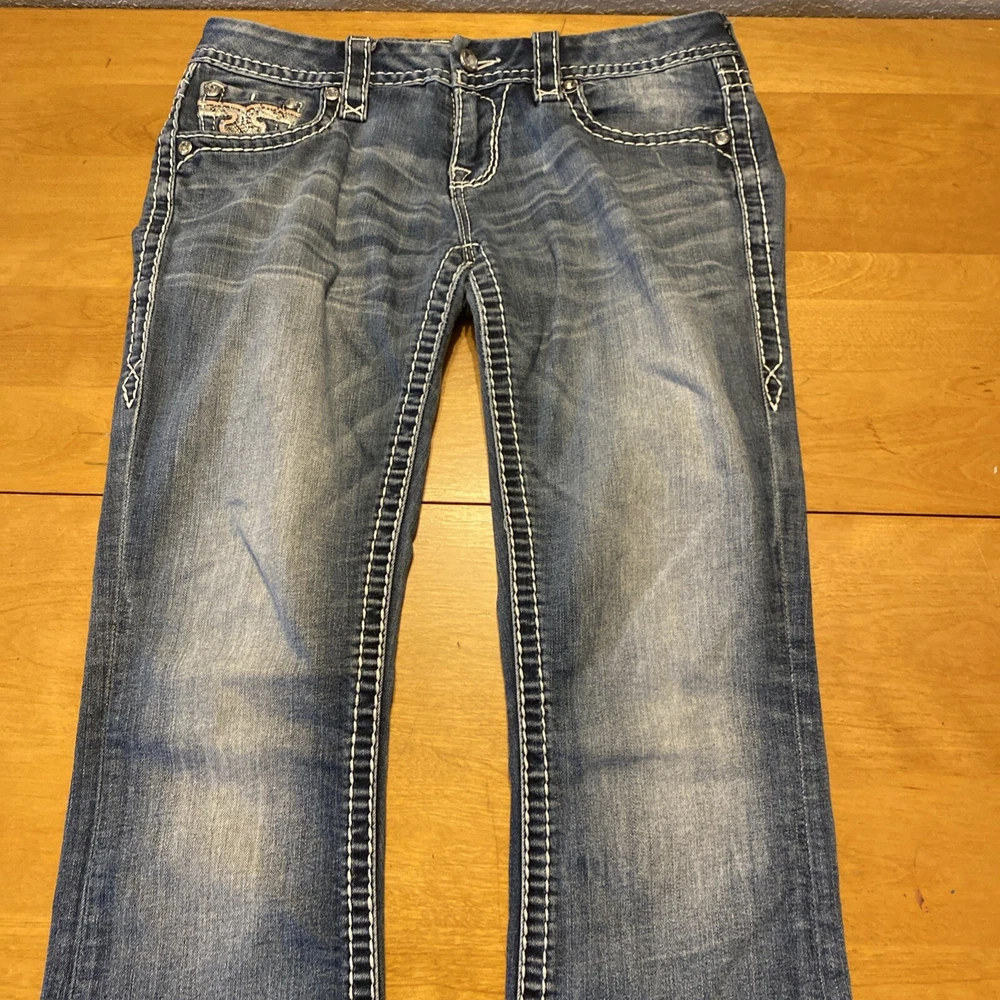 Elevate your denim game with these stunning Rock Revival jeans in size 28. The Betty Bootcut style features a flattering mid-rise fit with a zip and button closure. The jeans are made of a comfortable blend of polyester, viscose, cotton, and elastane that provides a stretchy fit with pockets for added convenience. These are pre owned jeans please look over pictures and measurements