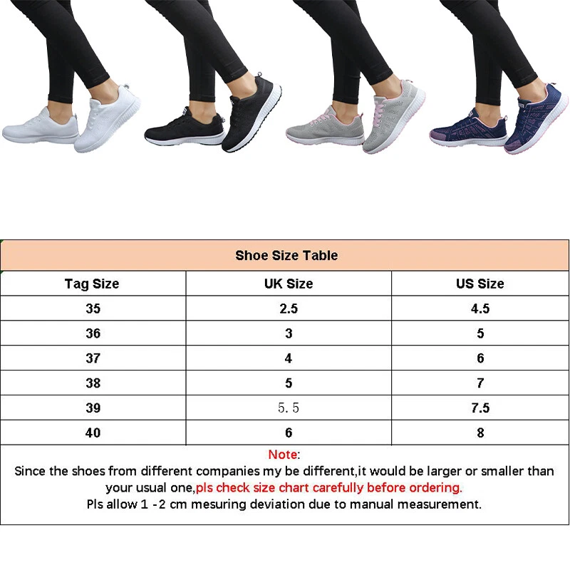 Product Description Womens Running Shoes Athletic Sneakers Walking Sports Tennis Gym Casual Trainers Product Details Description: Gender: Unisex, Women, Men Style: Sneakers, Trainers, Athletic Shoes, Running Shoes, Walking Shoes, Flats Pattern Type: Solid Color, Mesh Upper, Breathable Color: White, Black, Blue Pink, Gray Pink, Gray Green (Optional) Size: US 4.5, US 5, US 5.5, US 6, US 6.5, US 7, US 7.5, US 8, US 8.5, US 9 (Follow the size chart to select please) Upper Material: Mesh Cloth Outsole Material: MD Heel Type: Flat Fastening: Lace Up Toe Type: Round Toe Tube Height: Low Tube Season: Spring, Summer, Autumn, Fall, Winter Occasions: Casual, Daily, Sports Features: 1. The design of the upper solid color and mesh, stylish look, modified foot shape, enhance the owner's temperament. 2. These sneakers feature a mesh upper, flat heel and lace up. You'll never want to take this classic comfort walking shoes off. 3. Flat design, simple and monotonous version, highlighting the fashion trend. 4. Breathable and durable air mesh upper provides for superior breathable. 5. It will be the perfect foundation to your favorite casual pants. These shoes quickly become your new favorites for everyday wear. Package Content: 1 Pair Sneakers (Other Accessories are not included) Tips: 1. Please compare the detail sizes with yours before you buy!!! 2. Colors may be slightly different depending on computer and monitor settings. 3. Please allow 1-3cm differs due to manual measurement, thanks. (All measurement in cm and please note 1cm=0.39inch, 1inch=2.54cm) Payment Shipment Terms Of Sales About us Contact us Great appreciate for prompt payment. Unpaid item will be filed without receiving payment in 14 days after listing ended. 1. All items will be shipped to buyer's ebay address. Before you pay, please make sure your address in ebay matches the address you would like us to ship to. 2. We will dispatch the item in business days (weekends and public holidays are not conginized as business days) after confirming your full payment. 3. As there are weight and cubage restrictions on international order, we are unable to offer you any discount. There is no local pickup service, no third party shipping carrier will be used. 4. Import duties, taxes and charges are not included in the item price or shipping charges. These charges are the buyer's responsibility. Please check with your country's customs office to determine what these additional costs will be prior to bidding/buying. 1. We are committed to give you the best customer service possible. If the item disappoints you for any reason, please contact us and we'll assist you with a prompt solution. We'd like to settle any problem in a friendly manner. 2. We want to make sure you are happy with our item. If you want to return the item for any reason, contact us within 14 days from the delivery date and we will give you a refund or exchange. Only unused, undamaged and original condition item can be qualified for a return. Buyer is responsible for return shipping fee. Please contact us to get a RMA number BEFORE sending out your return. Goods without RMA number will NOT be accepted. Please write the RMA number on the returning package. 3. We will not be liable to customer for any damages beyond the amount of money that customer actually paid us. Our aim is to offer our clients items with high quality and fast delivery, also our price will be reasonable. 1. We are care about our valued buyers. Please contact us through email with any questions or concerns. We will reply your messages within 2 business days. Emails, which are received at weekend, will be replied on Monday. If you do not receive a response in expected time period from us, please check your junk or spam mailbox. 2. If you are happy with our item and service, please do leave us positive feedbacks and 5 stars rate. Please email us before leaving any 1 or 2 ratings, neutral or negative feedbacks or open any cases. We understand the concerns and frustrations you might have and we, of course, will do our endeavor to resolve the issues. Please give us opportunities to resolve any problems. We thank you for your effort to make this sale and purchase experience a happy one!