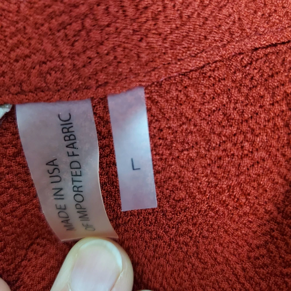 Women's Soft Surroundings Mesa Button Vest, long red draped open front vest, size L large. Vest features relaxed lapels, textured material, and 3 large chunky buttons on each side. Very boho lagenlook and a great color for the holidays or any bold feature. Measurements are approximately 32.5" in length and 23" from pit to pit. Material content is 69% acetate/29% polyester/2% spandex.