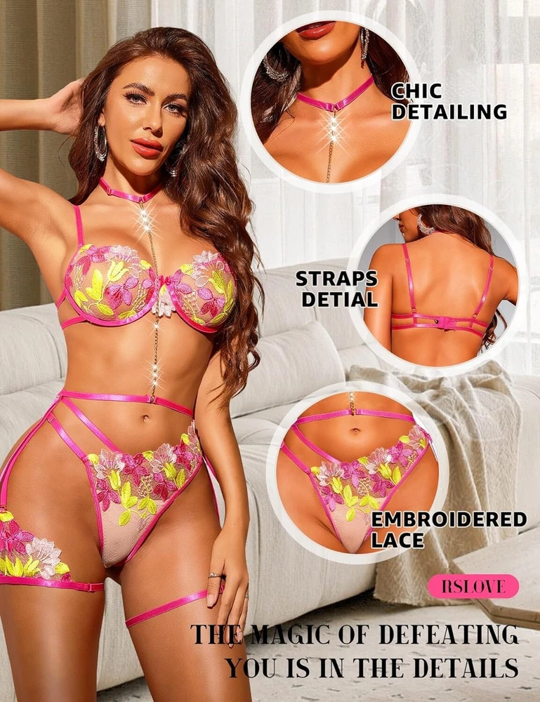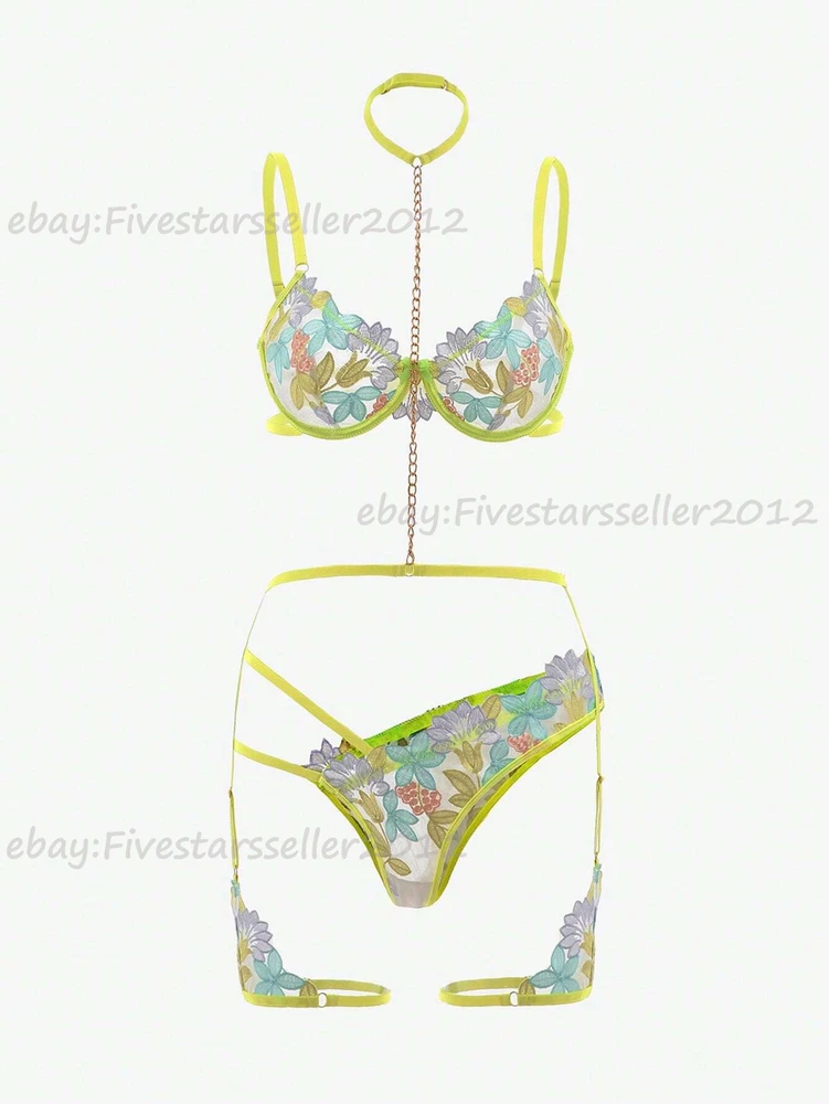 About this item: ✨Chic Choker & Garter: This lingerie set has a removable choker. The choker is connected to the waistband and garter belt with a dazzling chain. The garter height is adjustable, and the straps have elasticity. With the integrated set, you no longer have to worry about finding matching accessories. The sexy choker garter belt enhances the overall sophistication of your outfit, providing the maximum visual impact. As a seductive and exotic lingerie, it will instantly ignite the flames of desire. 🌺Exquisite Floral Lace: This is a floral embroidery 3-piece sexy lingerie set. The bra, panties, and garter belt are adorned with gorgeous and vibrant colored floral patterns, transporting you to a blooming garden. The panties stand out from ordinary lingerie sets with asymmetrical design, adding a touch of uniqueness and allure. Put on this captivating lingerie and unleash your passion. 💖Underwire Support: The bra straps are adjustable, and feature an internal underwire design, providing perfect support and shaping effects. It enhances the allure of your bust line and ensures a slim and snug fit. Come and showcase your sizzling curves with this embroidered lingerie set. 💋Versatile for Every Occasion: This enchanting lingerie set isn't just reserved for special nights; it's your passport to radiance on a multitude of occasions. Whether you're celebrating an anniversary, kindling the flames on Valentine's Day, dancing under the stars at a music festival, or capturing intimate moments in a boudoir photoshoot, this set is designed to elevate every experience. 🌹Package: 1* Choker with Leg Garter Belt, 1* Lace Bra, 1* Embroidered Panty, Each piece embodies exquisite lace craftsmanship, ensuring a harmonious blend of sophistication