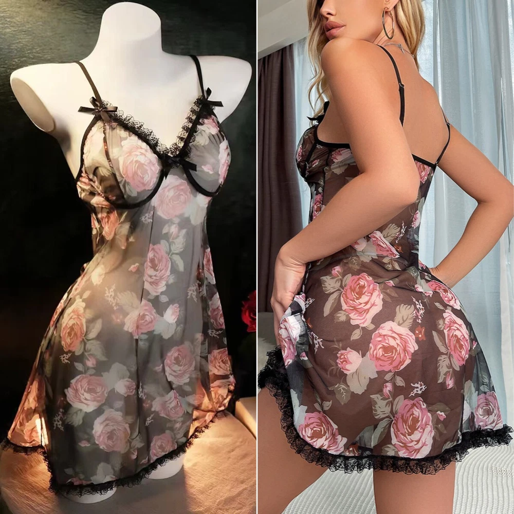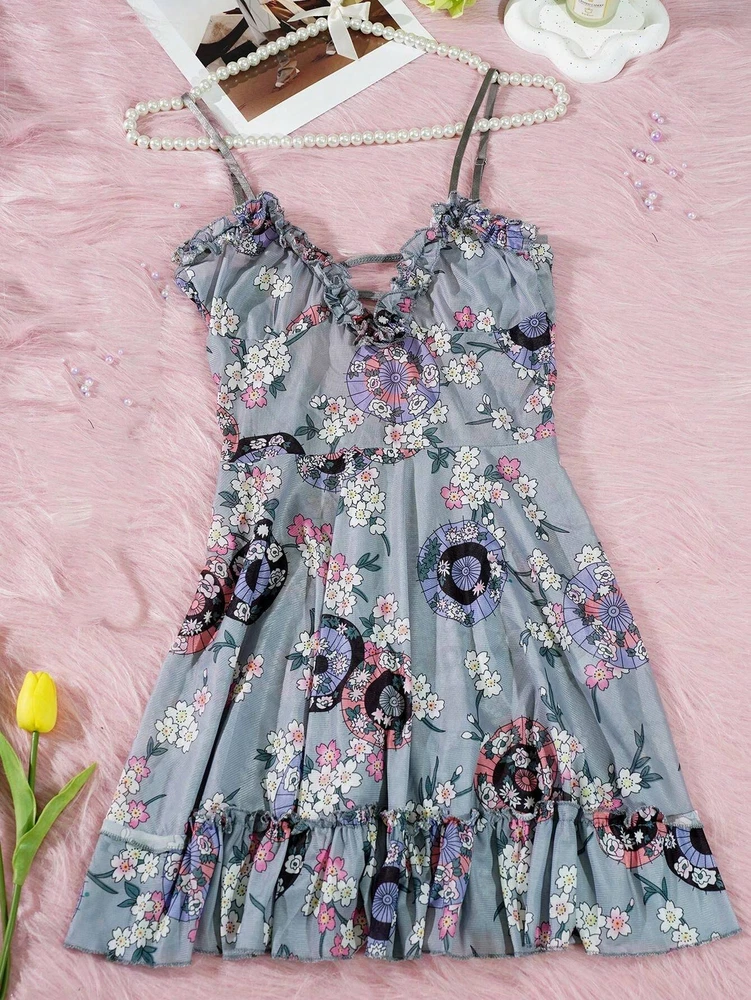 Women's Sexy Lingerie with Paper Umbrella Print Strap Sleep Dress Babydoll Gown