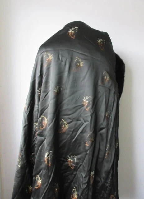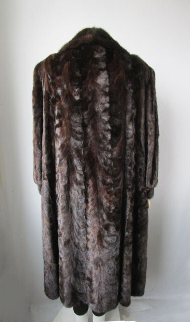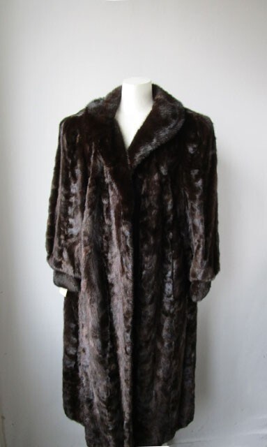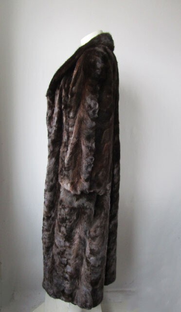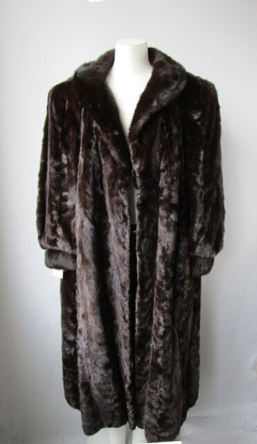 I tem Description: Stylish natural dark ranch mink fur coat for women. Warm and cozy generous mink fur collar, front furrier closures , slit pockets and durable satin lining complete the look of this quality fur coat. Fur is in mint condition. Cleaned and glazed SIZE: 10 LENGTH: 43" SLEEVES: 29" Measured from the side base of neck.