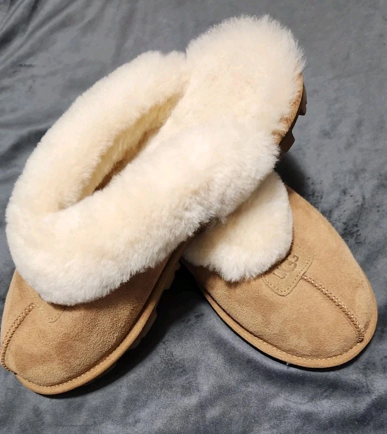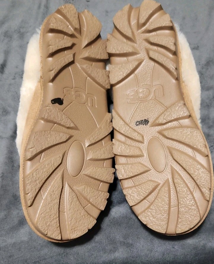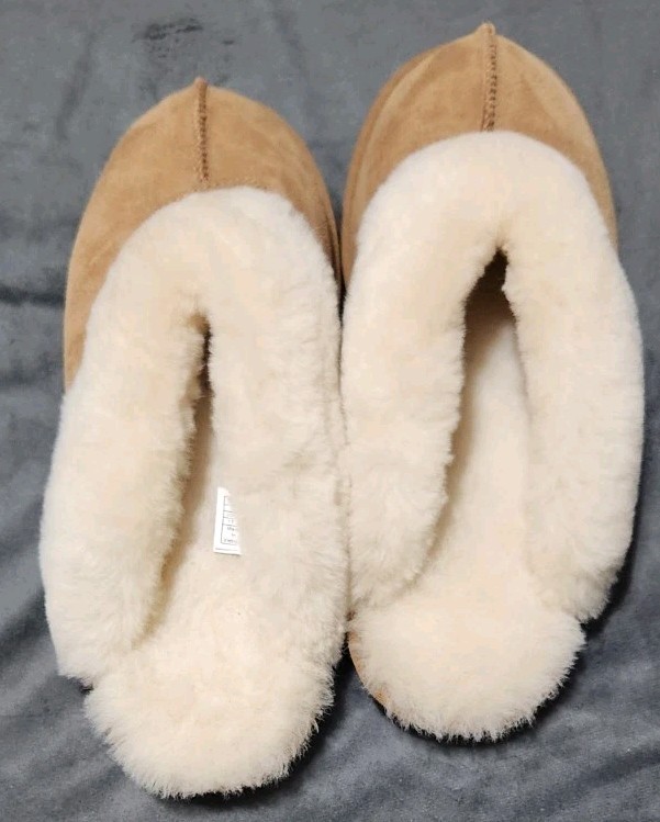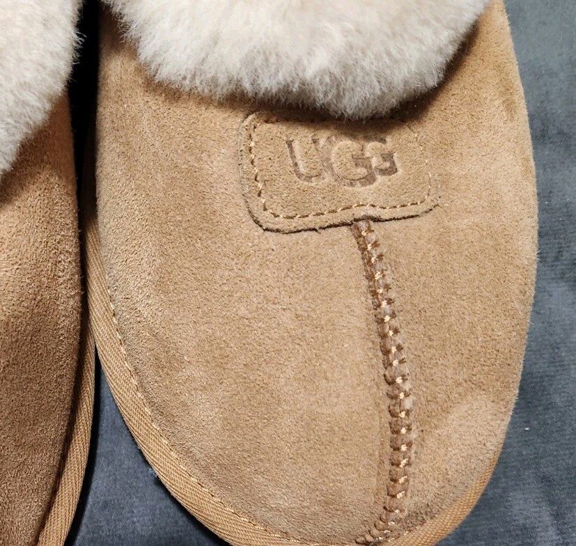 The product is a pair of UGG slippers in women's size 11, designed for comfort and coziness. Made with suede upper material and featuring a slip-on style, these brown slippers are perfect for lounging around the house. With the brand's signature Australian theme, these slippers are both stylish and practical for everyday wear. Perfect for adding a touch of luxury to your home, these UGG slippers are a must-have for any woman looking for comfort and style.