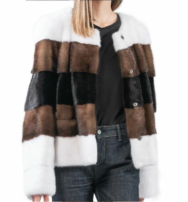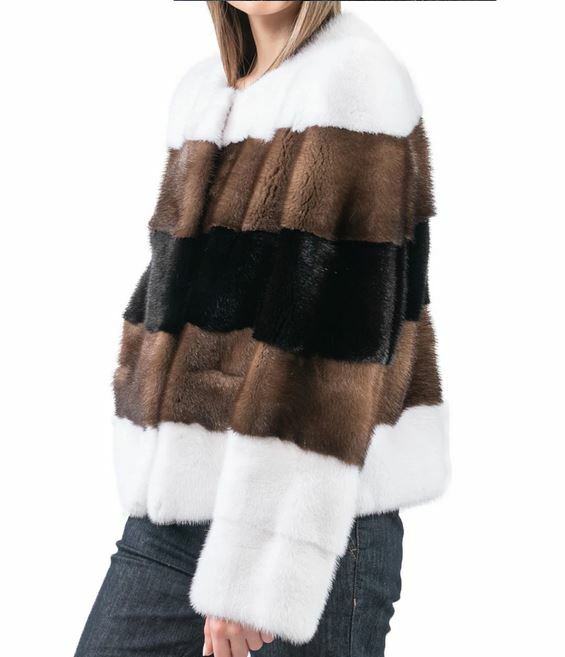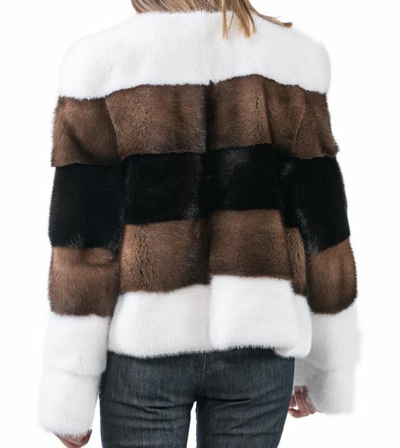 I tem Description: Stylish and natural white, black, demi-buff (brown) color mink fur jacket coat. Top quality soft and supple full mink fur pelts in a horizontal design, 3/4 sleeves , durable furrier closures, front pockets and quality satin lining complete the look of this gorgeous mink fur jacket SIZE: 10 Most sizes available LENGTH: 21"