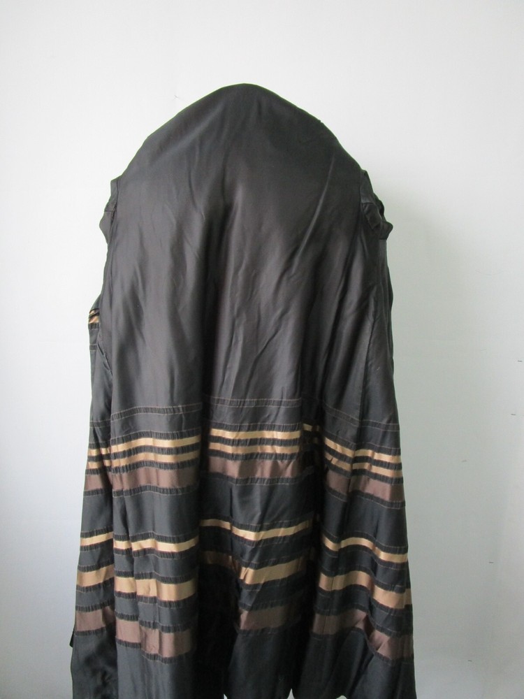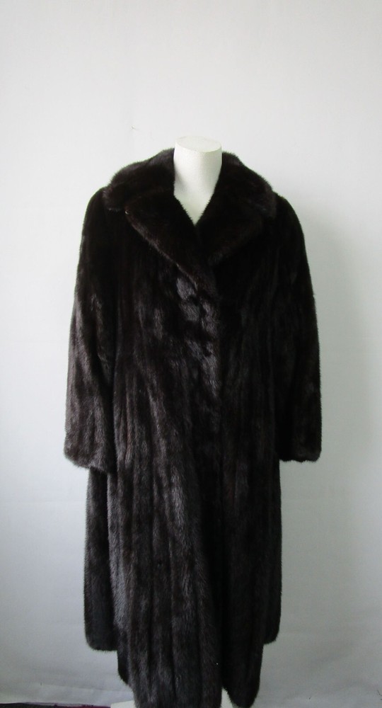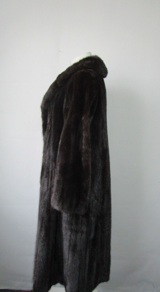 I tem Description: Spectacular dark ranch mink fur coat for women. Top quality full Canadian soft and supple mink fur pelts, shawl style mink fur collar, side slit pockets, front furrier closures and durable satin lining complete the look of this beautiful fur coat. Both fur and lining in mint plus condition. SIZE: 6 Chest all around 40" LENGTH : 45" SLEEVES : 29"