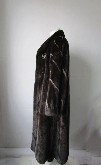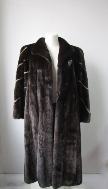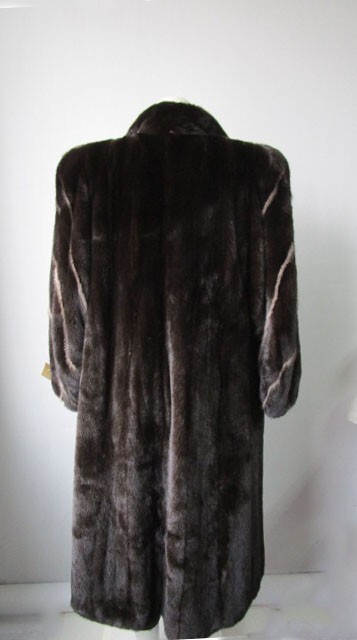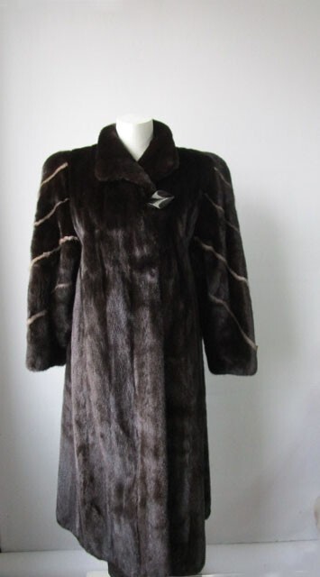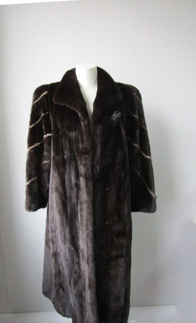 I tem Description: Glamorous mink fur coat for ladies with natural sapphire mink fur inserts on sleeves. S of t and plush mink fur collar, side slit pockets, front durable furrier closures and satin lining complete the look of this luxurious mink fur coat. Produced with superb quality full Canadian mink fur pelts. Fur and lining in excellent condition. Cleaned and glazed. CLEARANCE SALE Size: 8 Chest coat closed 42" Length: 47" Sleeves: 30" Adjustments are free of charge