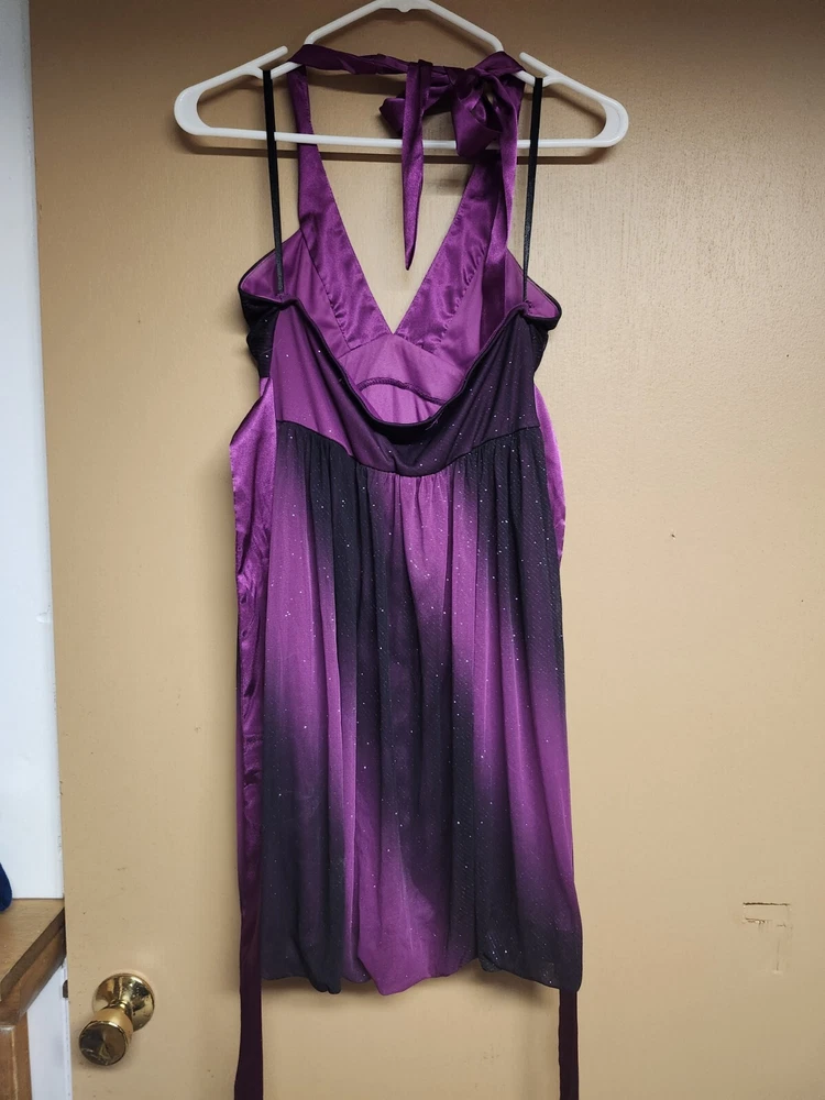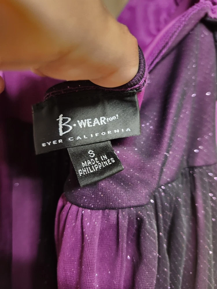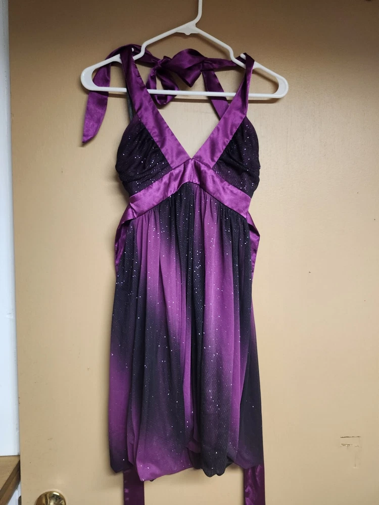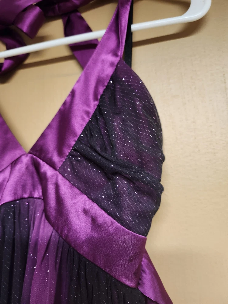 Women's size small, Byer California brand, purple and black colored, glittery, sparkly, halter neckline wrap dress prom dress. 100% polyester material.