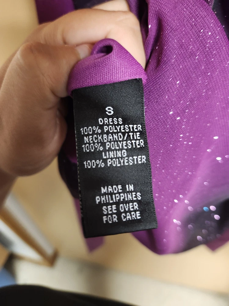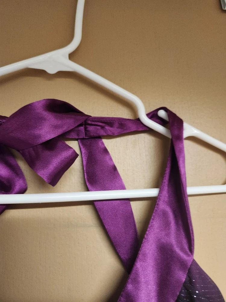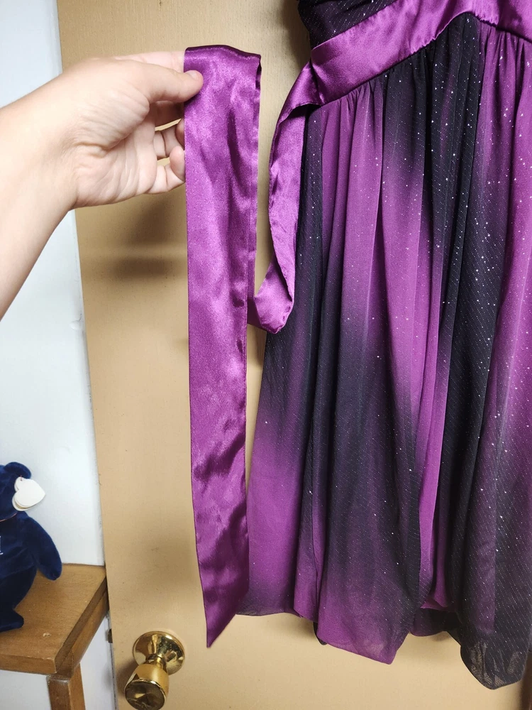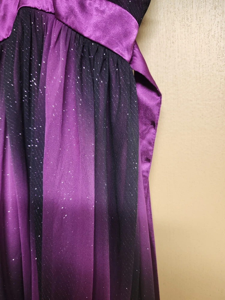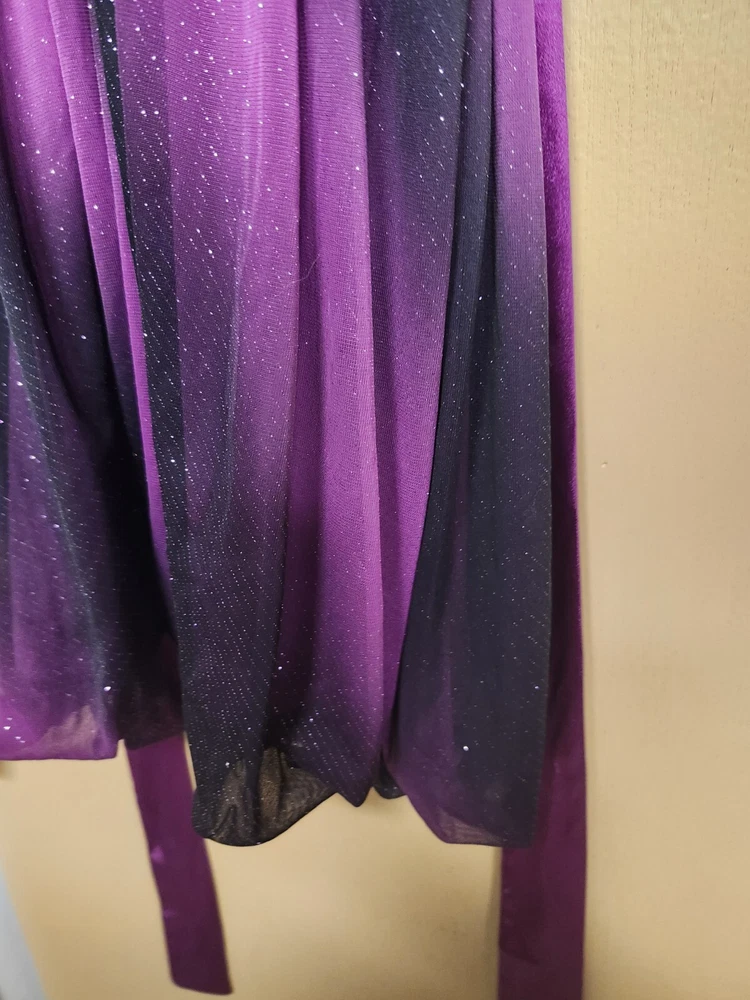Women's size small, Byer California brand, purple and black colored, glittery, sparkly, halter neckline wrap dress prom dress. 100% polyester material.