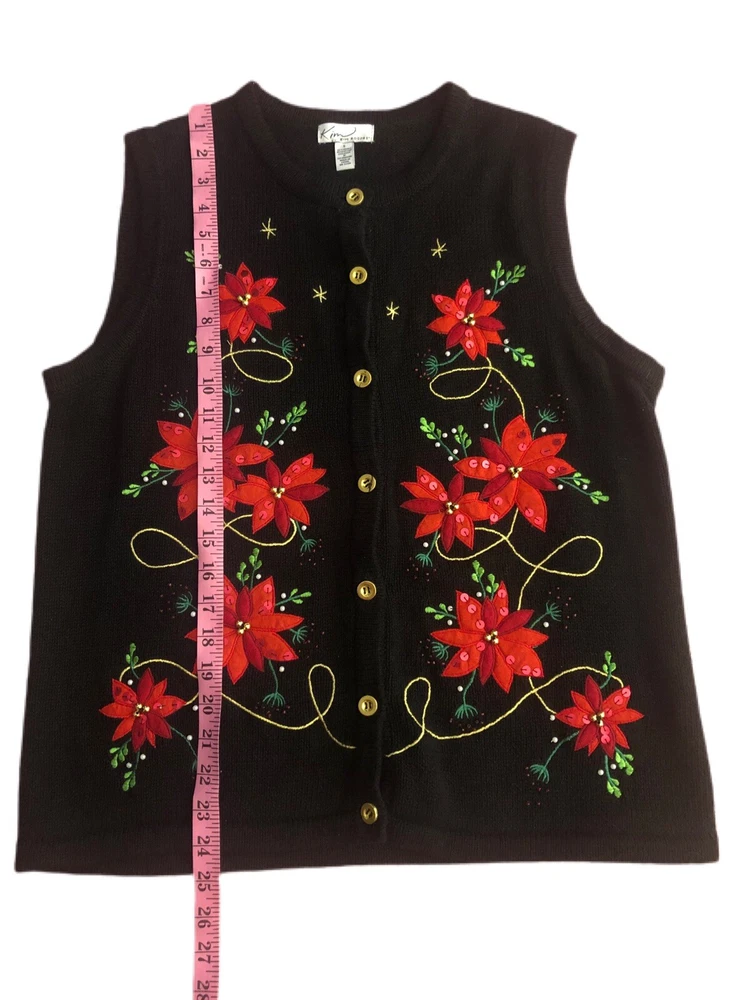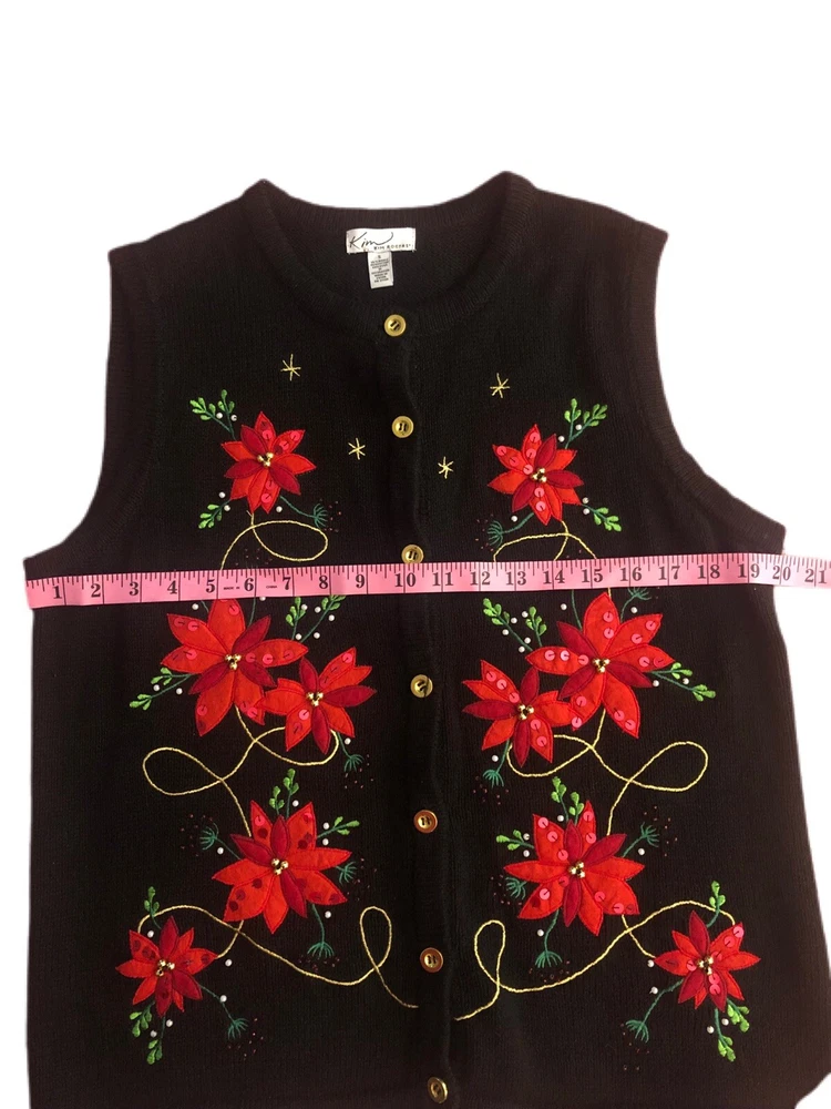 Women's Small Ugly Christmas Kim Rogers Black w/Poinsettias Button Front Vest Great for Christmas Parties Full button front Embroidery detail with sequins SHIPPING usually ships same day or next day after payment THANK YOU for looking! Free smoke & pet house Priority mail shipping !! Pba75