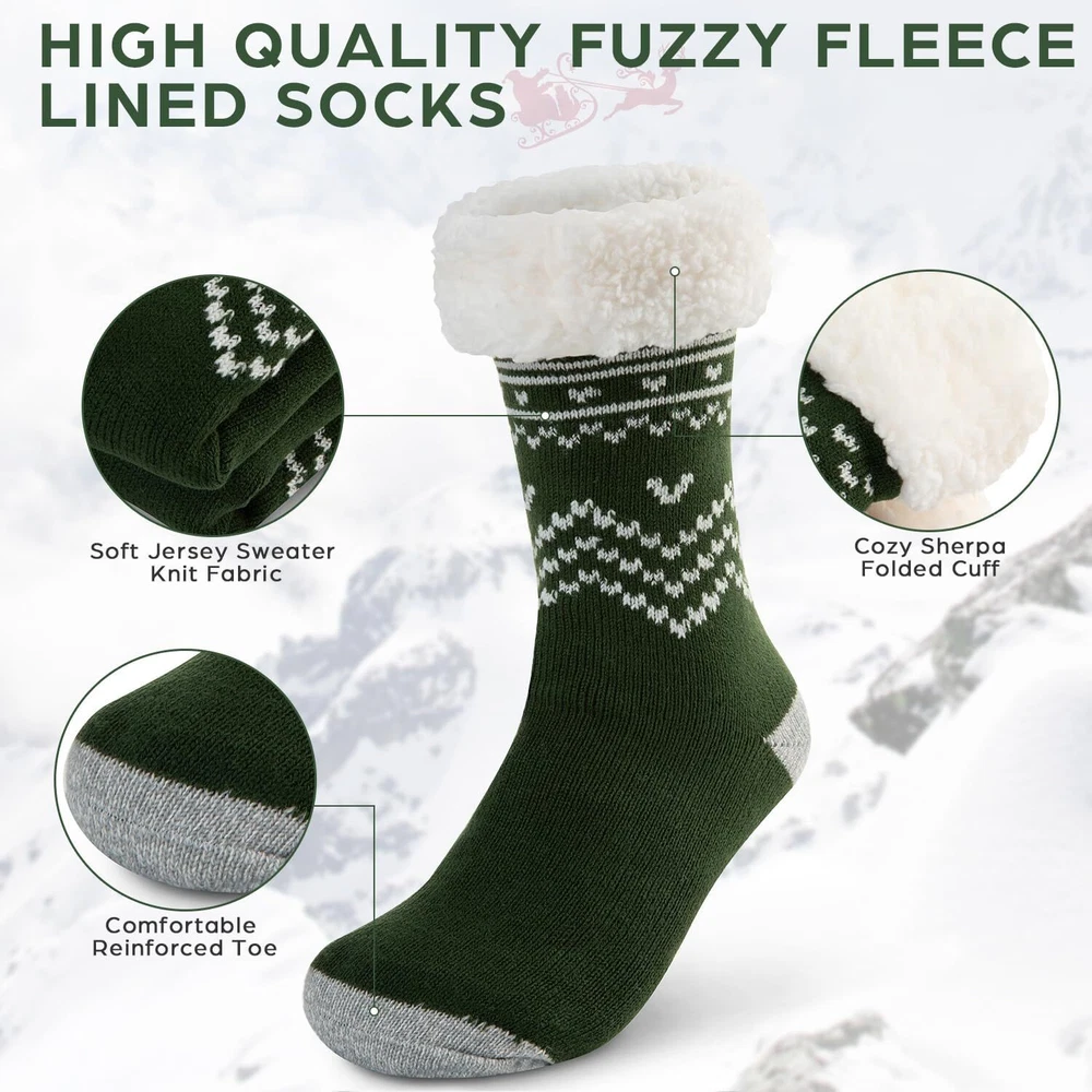 Product Description Cloud-Like Fleece Slide into a soft, fleece interior that provides plenty of warmth and all the comfort you could hope for. The thick construction makes these slipper socks extra durable and provides plenty of cushion. Non-Slip Bottoms No reason to ever take them off! The silicone studded bottoms grip surfaces so you can easily stay sure-footed, even on smooth floors. Perfectly Giftable Styles for the whole family! Give the perfect gift they're sure to love with these high quality, warm slipper socks. With bright hues and creative designs, there's a look for any friend or family member. Next Level Comfort & Warmth High Quality Construction With Soft Sherpa Lining Sherpa lined for softness and sweater knit in cute patterns, these slipper socks stay warm while chilling out. Nonslip soles make every step more confident and cozy. Knitted slipper socks with sherpa fleece lining. Silicone treaded bottoms, anti-skid grip tread. Warm & soft extra thick double layer, crew length socks. Fashionable and Fuzzy lounge booties for fall and winter. Great Holiday Christmas gifts and stocking stuffers. Feel The Softness Treat your feet to something special. Luxurious fleece and dual layered construction make these slipper socks not only toasty warm, but extra durable.