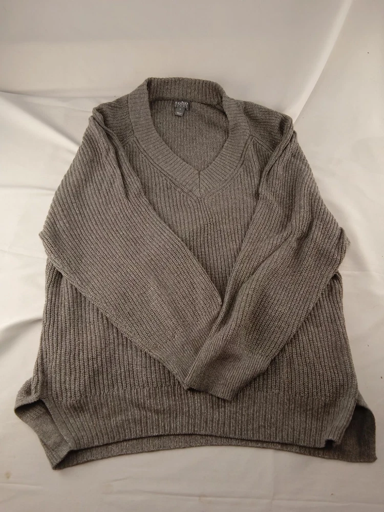 This Women's Soho New York & Company Jeans Sweater is perfect for a casual day out. The gray color and tight-knit acrylic material make it warm and comfortable to wear. The 3/4 sleeves and V-neckline add a touch of cuteness to the sweater, while the laced-up back gives it a stylish edge. The sweater is a size small and is designed for regular-sized women. It is a pullover style sweater with a solid pattern and knit fabric type. The sweater is not vintage and is perfect for any casual occasion.