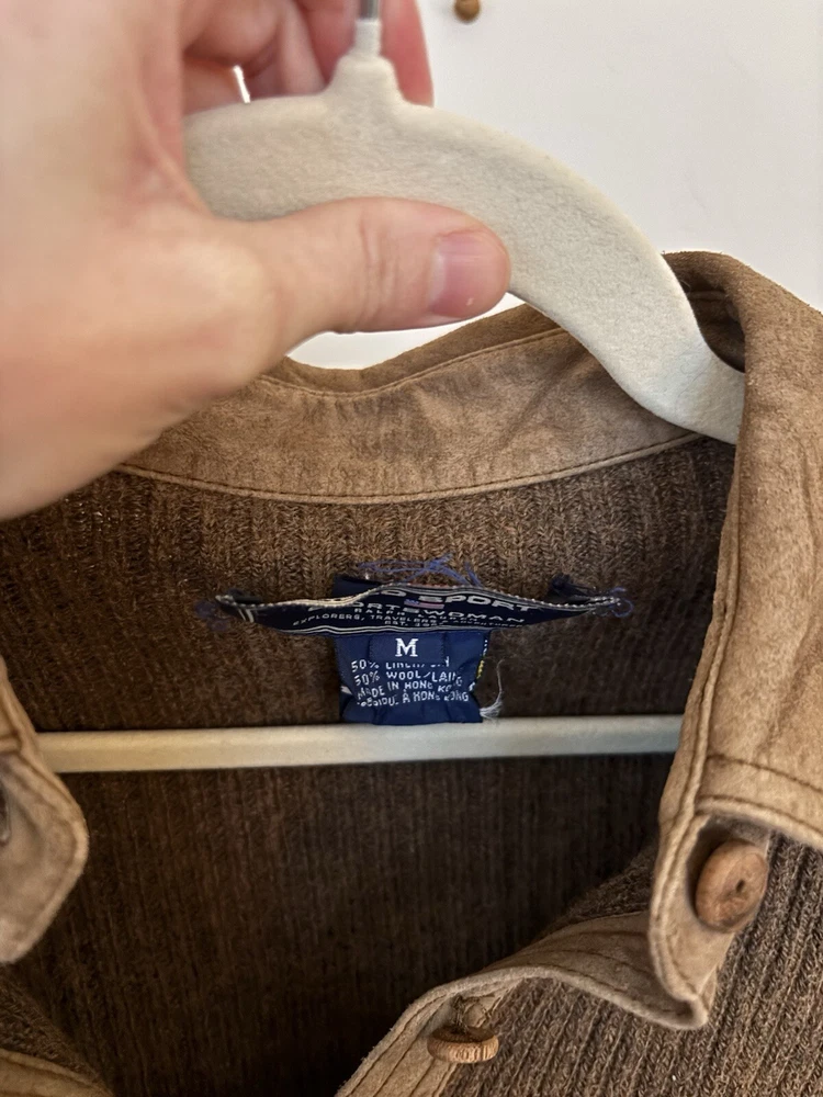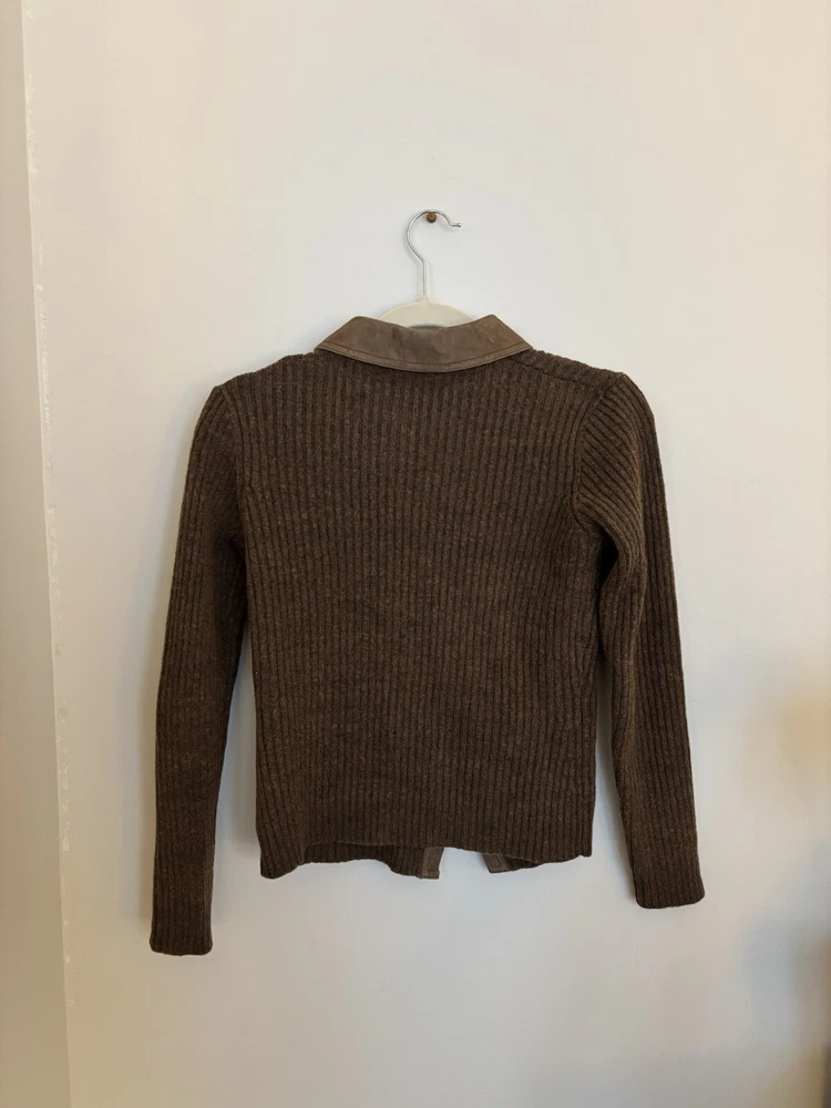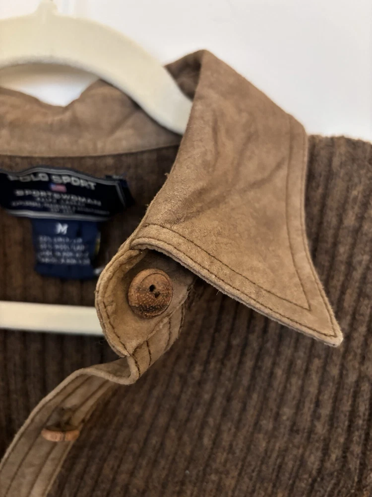 This is a women's Ralph Lauren sweater in size M, designed as a button-up cardigan style in a brown color. It is made from a blend of 50% wool and 50% linen, featuring a knit fabric type with accents of wooden buttons. The sweater exudes a sporty theme, perfect for casual or athletic wear. Some of the buttons are a little loose and the tag is starting to fall off, otherwise it is in perfect condition!