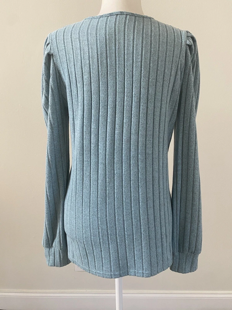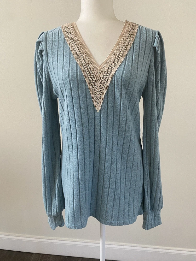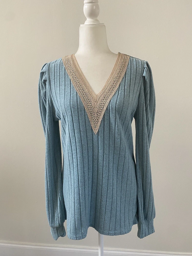 Elevate your wardrobe with this stunning sky blue and beige lace V-neck sweater. The tight-knit polyester knit fabric offers comfort and stretch, making it perfect for any occasion, whether it's a party, a casual outing, or a business meeting. The long sleeves and breathable material make it suitable for all seasons, while the regular fit and flattering neckline ensure you look your best. This lightweight sweater is machine washable and features a solid pattern that is perfect for pairing with your favorite jeans or dress pants. It's a versatile piece that is perfect for any fashion-forward woman. Don't miss out on this amazing addition to your wardrobe! Pit to Pit: 19.5”; Length: 26”. Condition of the item is Pre-Owned in great shape! Shipped asap by USPS ground advantage mail.