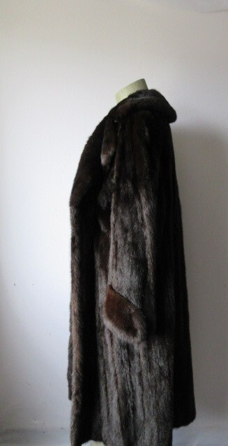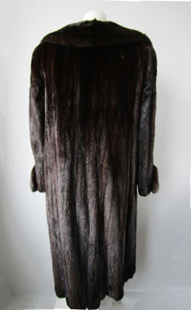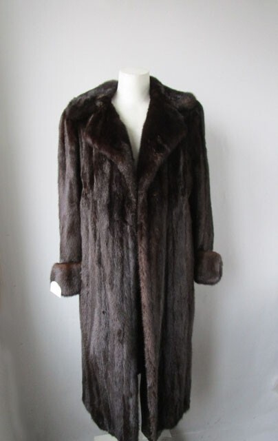 I tem Description: Beautiful natural dark ranch mink fur coat for women. Stylish notch style mink fur collar, top quality Canadian full mink fur pelts, side slit pockets, front furrier closures, durable satin lining complete the look of this beautiful fur coat. Fur and lining in mint condition. NO tears, rips, holes, odors etc. Cleaned and Glazed. SIZE: 12/14 Chest Closed 47" LENGTH : 46" SLEEVES : 29" Adjustments are free of charge
