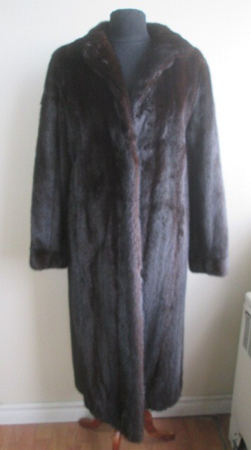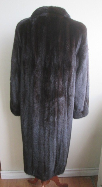 This fur garment, which is entirely "Made in Canada," is not subject to US tariffs. I tem Description: Elegant top quality and super soft FEMALE mink fur coat for ladies. Warm and cozy mink fur collar, full Canadian mink fur pelts, front furrier closures , side pockets, satin lining complete the look of this spectacular fur coat. Both fur and lining excellent condition. Cleaned and glazed and ready to wear. SIZE: 8 LENGTH : 44" SLEEVES: 30"