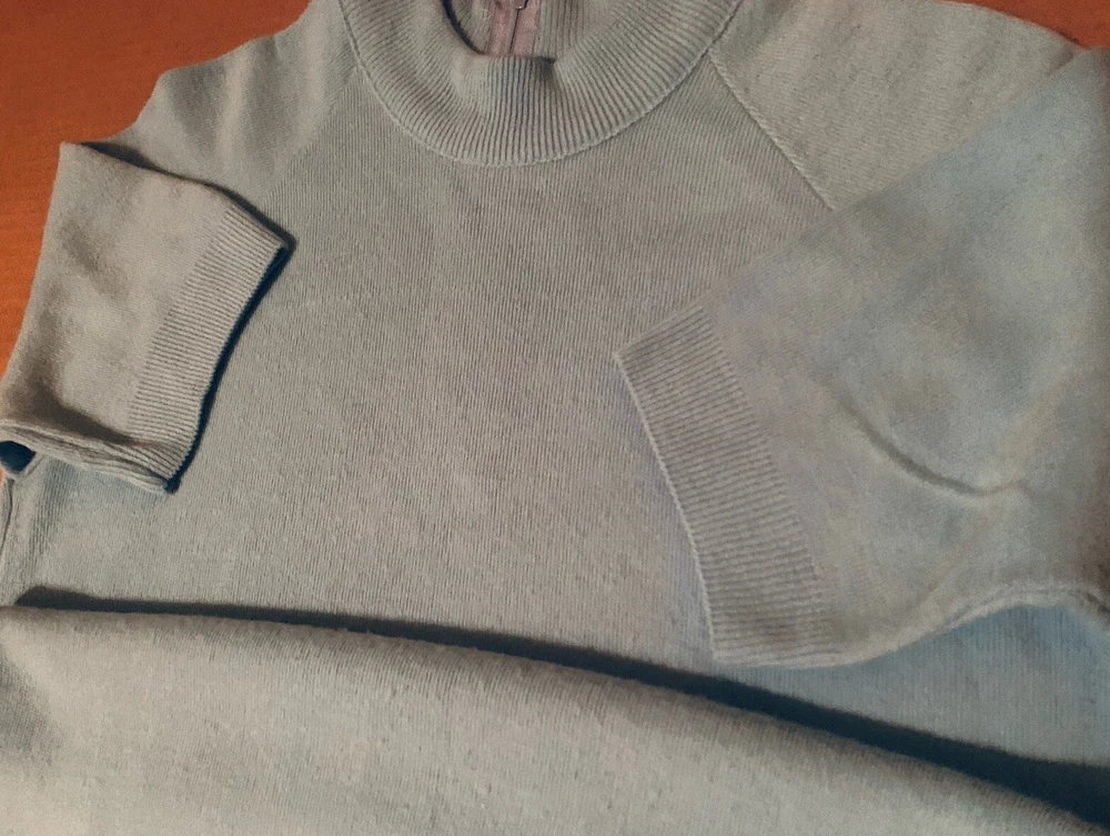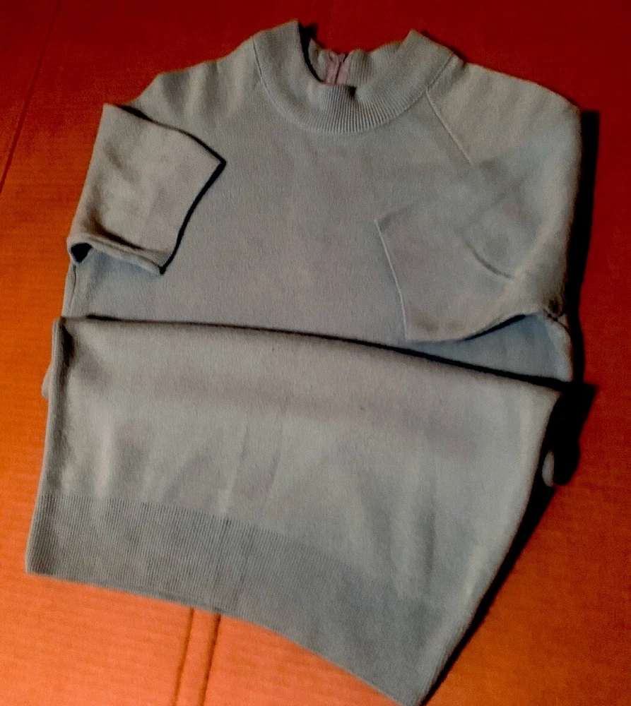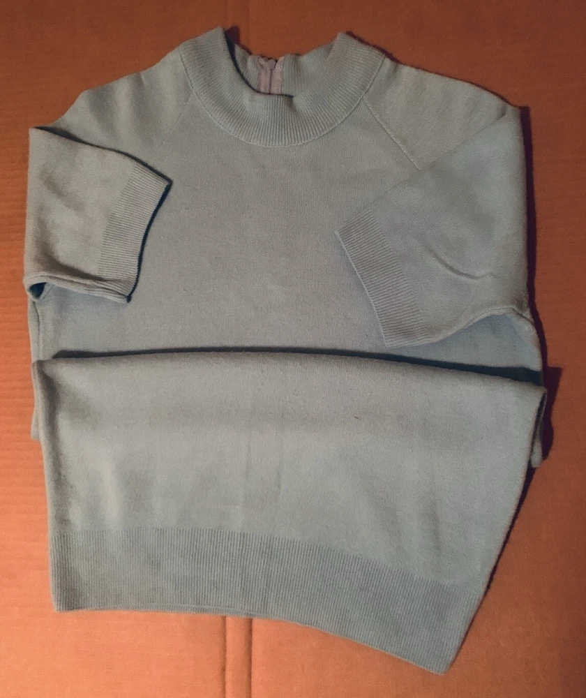 Women’s Beautiful Sz M Baby Blue Pullover Sweater, Back Zip Closure, Short Sleeves, 100% Acrylic, Ribbing on Arm & Waist Hems, Collar, Lightweight All Season