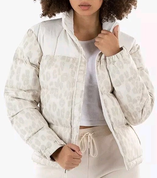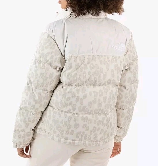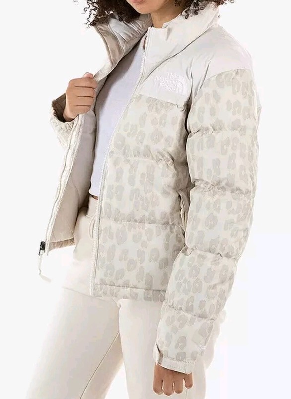 Insulation Material: Down Department: Women Fabric Type: Fleece Accents: Logo, Zipper Outer Shell Material: Polyester Closure: Zip Style: Overcoat Occasion: Casual Color: Silver Jacket/Coat Length: Short Size Type: Regular Size: M Type: Jacket Season: Winter Brand: The North Face Features: Insulated, Hooded, Water Resistant Pattern: Animal Print Lining Material: Polyester Theme: Leopard