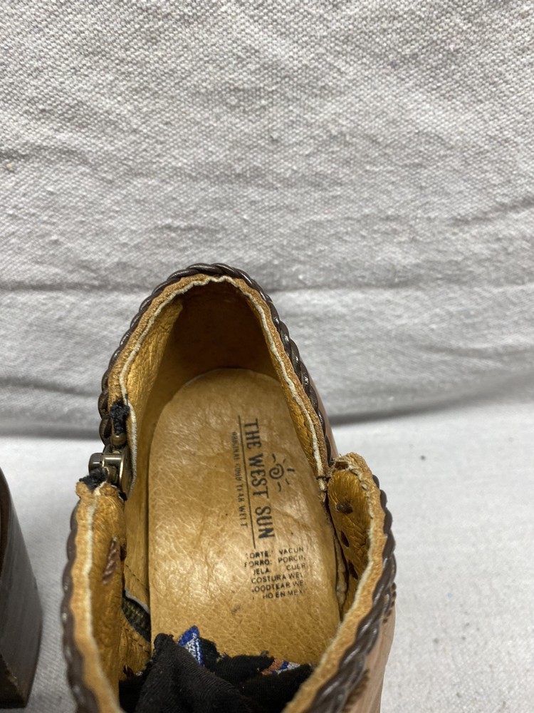 EU Shoe Size: 39.5 Features: Comfort, Cushioned AU Shoe Size: 7 Closure: Zip Type: Heel Heel Height: Mid (2-2.9 in) MPN: Does Not Apply US Shoe Size: 9.5 Brand: The West Sun Upper Material: Leather UK Shoe Size: 7 Customized: No Character: Boots, Cowgirl Season: Fall, Spring, Summer, Winter Lining Material: Leather Style: Ankle Heels Outsole Material: Leather Insole Material: Leather Vintage: No Heel Style: Block Department: Women Occasion: Business, Casual, Formal, Party/Cocktail, Travel, Wedding, Workwear Platform Height: 2 in Seller Notes: “Lightly used heels in very good used condition.” Color: Brown Heel to Toe Drop: 3 mm Shoe Width: M