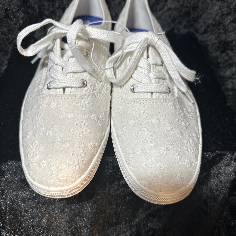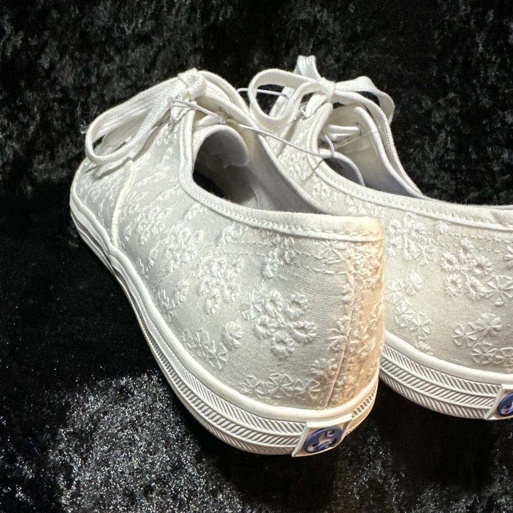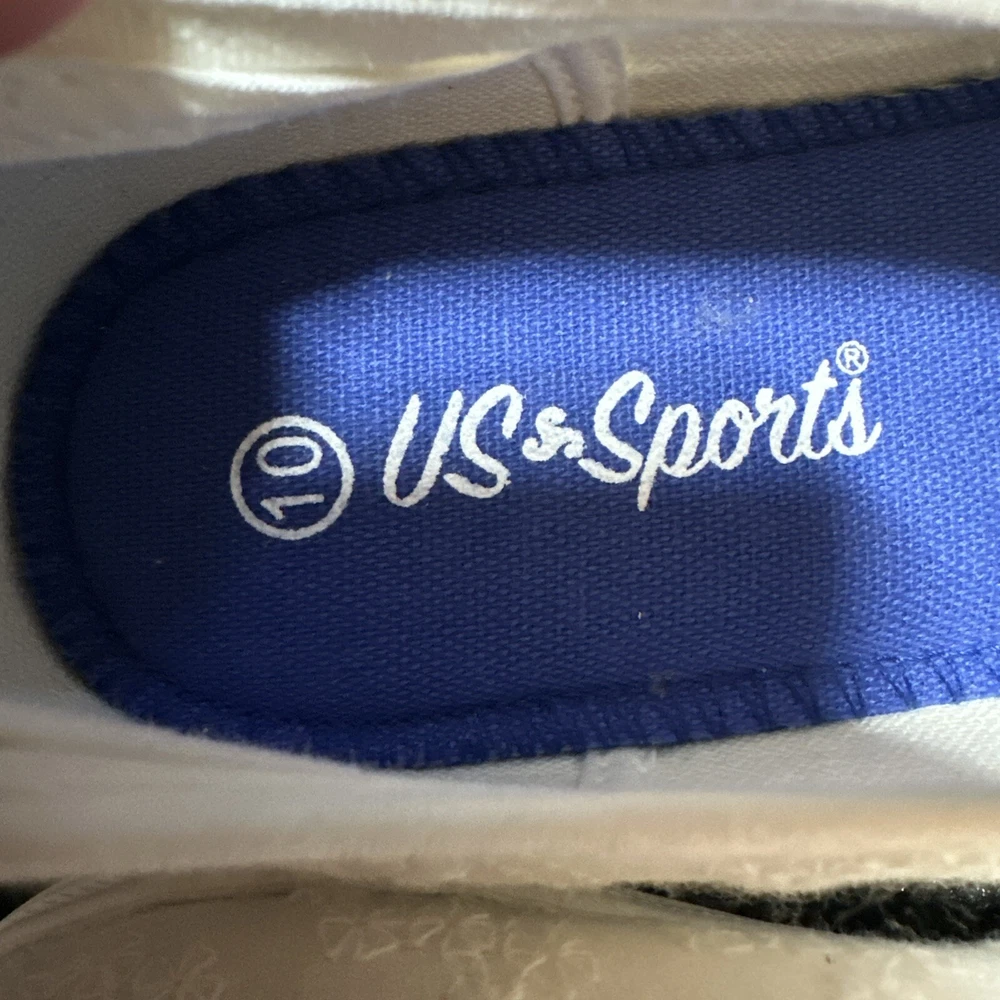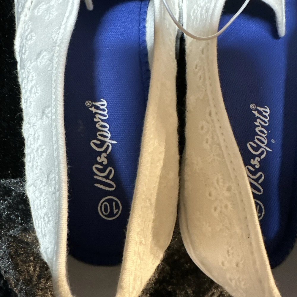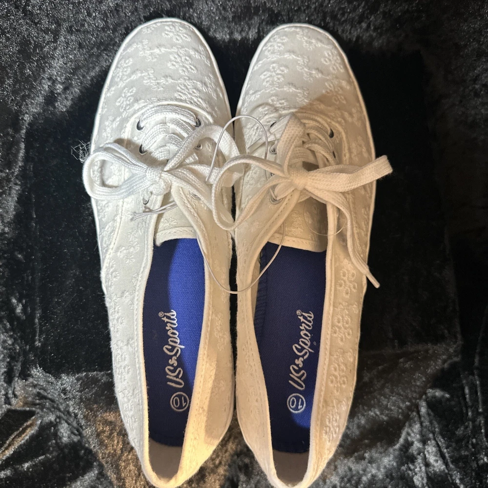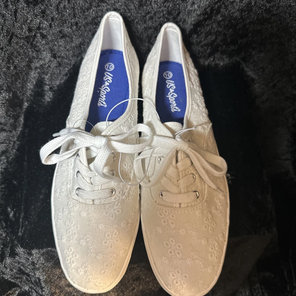 These are Women's US Sports White Shoes in Size 10. They are Low Top sneakers with a floral pattern, lace-up closure, and made of breathable canvas material. The shoes are lightweight, comfortable, and suitable for activewear and casual occasions. Ideal for walking, running, jogging, or the beach, they feature a rubber outsole for traction and foam insoles for added comfort. Perfect for summer, fall, and spring seasons.