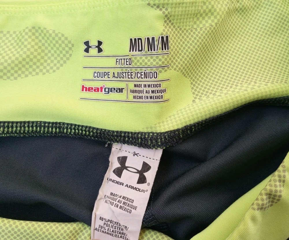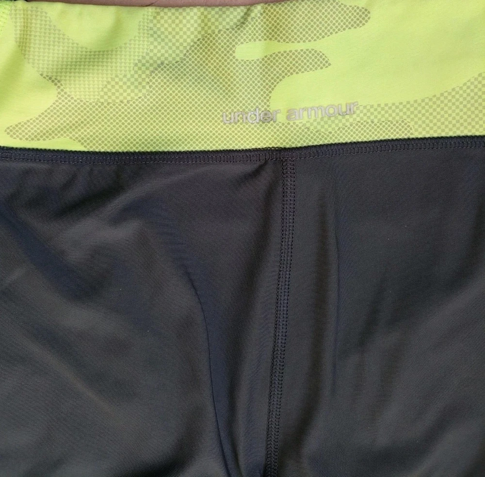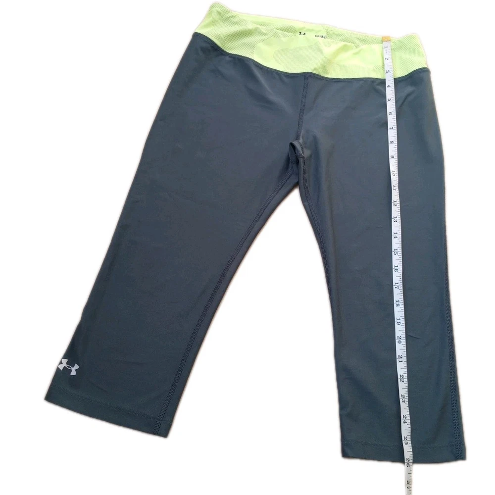 These Women's Under Armour Althetic Capri Leggings in size medium feature a pull-on closure and a mid-rise fit, making them perfect for activewear occasions. Made from stretch fabric with an elastic waist, these leggings offer comfort and flexibility. The solid gray color with green accents and the Under Armour logo make them stylish for various activities such as gym & training, walking, yoga, and running. With a 17-inch inseam and a waist size of M/15 inches, these leggings are machine washable and designed for athletic fit. Perfect for all seasons, these leggings are a versatile addition to any woman's wardrobe.It's pre owned 👈
