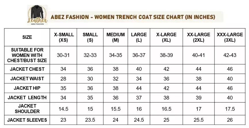 Abez Leather Fashion Item Details Women's Vintage Leather Trench Coat 100% Pure Lambskin Black Classic Jacket Coat Elevate your winter wardrobe with this women’s vintage black Lambskin long coat, combining classic style with timeless elegance. Crafted from 100% genuine ambskin leather, this coat is perfect for those who appreciate both fashion and function. - Made from 100% genuine lambskin leather for a soft, premium feel - Classic trench coat design with a vintage-inspired look - Rich brown color adds sophistication to any outfit - Ideal for winter, offering warmth and comfort - Versatile style, perfect for both formal and casual wear Available in all sizes for a flattering, tailored fit! Size and Color Consult the provided size chart in the image to ensure a perfect fit. Follow the instructions for accurate measurements. Unsure about sizing? Send us a message with your body measurements, and we'll tailor your jacket accordingly. Enjoy our FREE CUSTOMIZATION service to meet your specific requirements; simply get in touch with us. Explore a variety of COLORS by contacting us for your preferred choice. We Also Accepted Bulk Orders. Customize/Tailor Made Leather jacket for Men & Women in Sheep / Lamb antique leather jacket Customize your order to meet your specific requirements. Dear Customer, Please answer the below questions in order to serve you better : Shoulder = Chest = Arms = Waist = Sleeves = Tummy = Length of jacket = HIP = Actual height = Shipping Information Color of actual product may vary due to photography/light effects & also due to computer screen resolution and color settings. Buyer will bear custom-duty/Import duty charges. Orders are shipped using DHL or FedEx, occasionally utilizing India Post based on location and service accessibility. The Accessories of the Leather item such as Button, Zippers, & color might differ due to material availability in the market but we use Premium Quality only. Return Policy If you find that product is not as per product detail, we will accept a return for Item within 30 days of receiving item in original condition as it was sent and we will refund you EXCLUDING shipping charges. Buyer is responsible for return shipping & handling charges. A request you to Please don't leave negative or neutral feedback, if any problem with the product, you should contact us first and also don't open a case, first contact us we will fully help the buyer to resolve their problem. THANK YOU