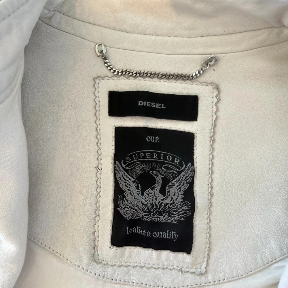 💌 Vintage Diesel leather jacket in a classic biker style 💌 Soft white leather with silver-tone zipper detailing💌 Quilted stitching on shoulders and upper sleeves💌 Asymmetrical front zip closure with snap collar💌 Two zippered chest pockets and adjustable waist tabs-✨In perfect condition✨ ✨Fall jacket; winter jacket✨✨Made with sheepskin leather✨ - Elevate your style with this stunning white leather jacket from Diesel. Crafted from high-quality sheepskin leather, this short-length biker jacket features long sleeves and a full zip closure. The jacket is accented with button, quilted, buckle, zipper, and logo details, making it a unique addition to your wardrobe. Ideal for travel, party, or casual occasions, this jacket is a must-have for any fashion-forward woman. The jacket is dry clean only and is available in size S. It is perfect for fall and winter seasons and is made in India. Add this vintage piece to your collection and make a statement wherever you go.